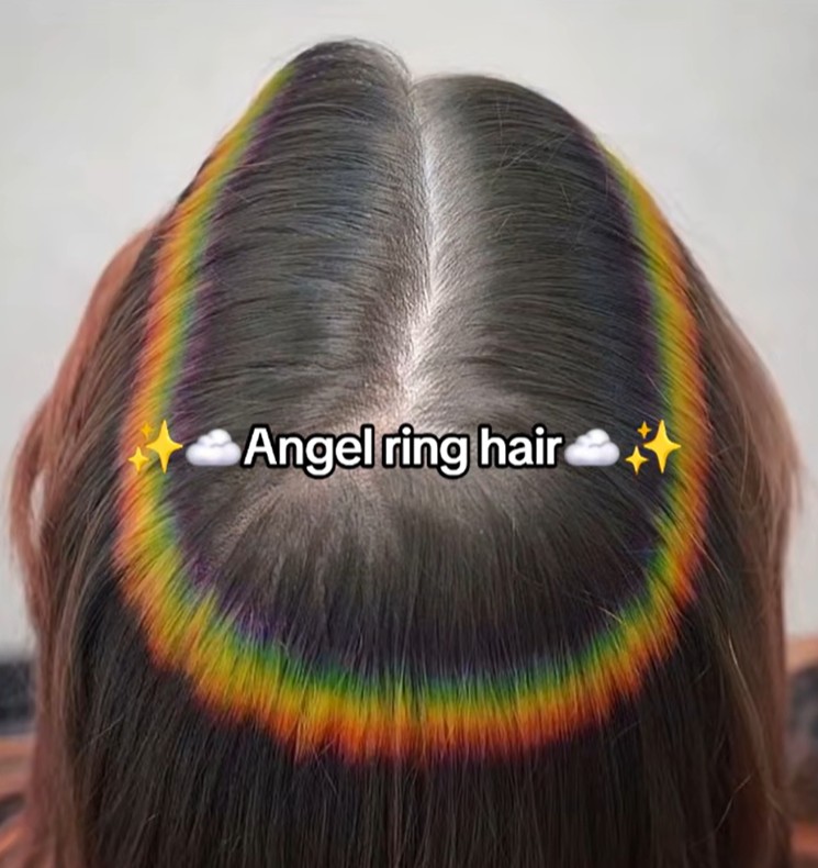 틱톡에서 ‘Angel ring dyed hair’를 검색하면 보다 여러 아이디어를 얻을 수 있는데요. 과감한 이들은 색다른 디자인을 얹기도 합니다. 취향에 따라 파란색, 빨간색 같은 컬러를 넣기도 하고 사진처럼 여러 컬러를 층층이 얹어 무지개빛으로 표현하기도 합니다. 상대적으로 화려한 컬러들은 봄 보다는 여름에 더 잘 어울리겠죠?