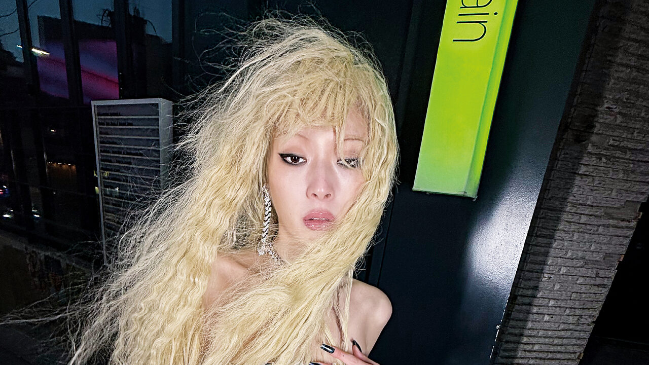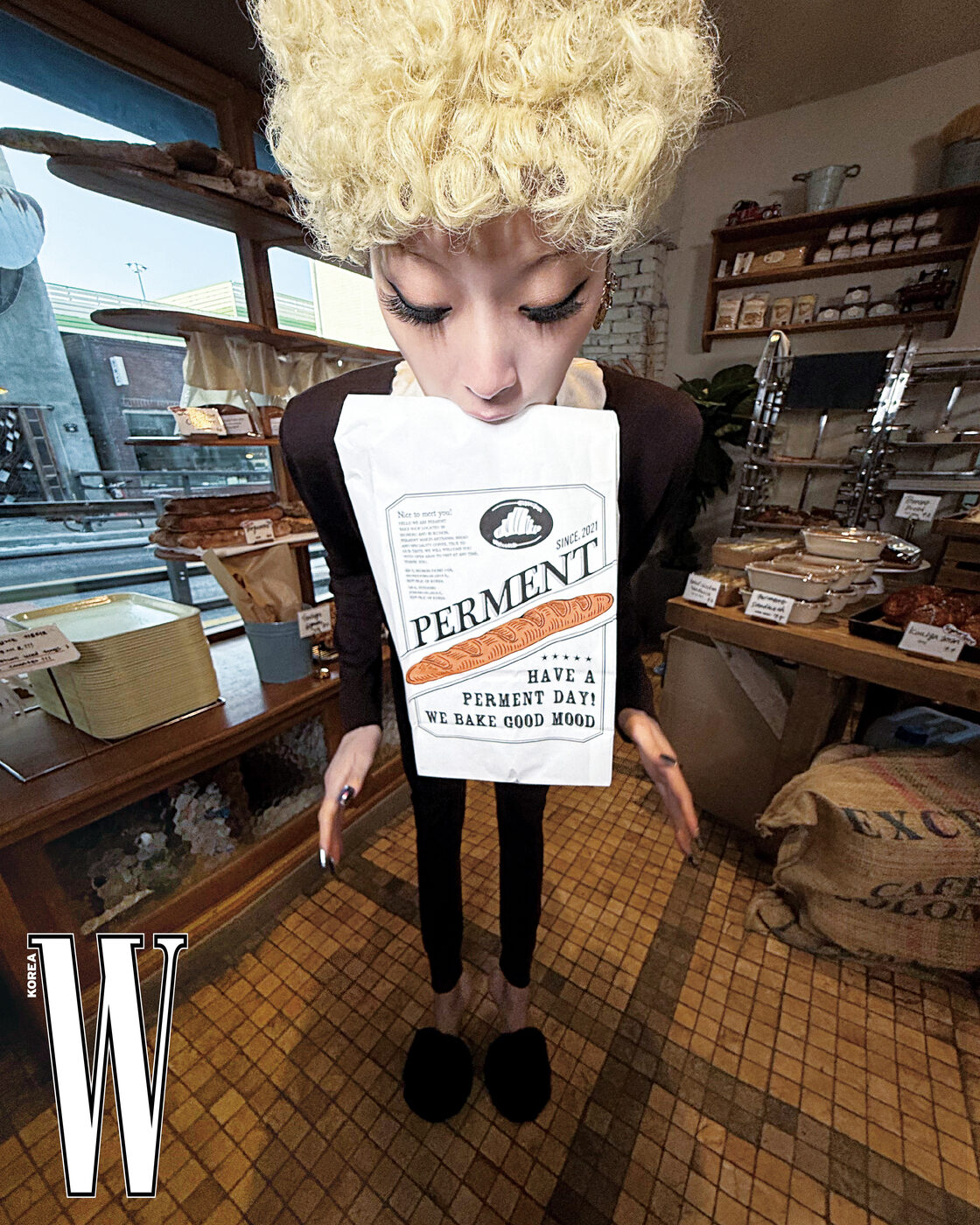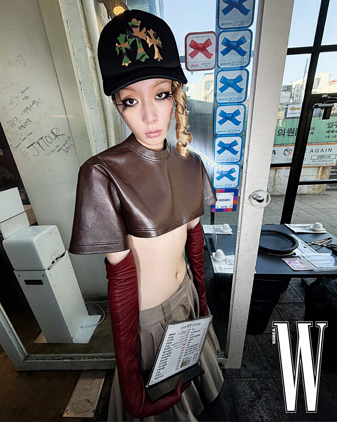 모자는 크롬하츠, 크롭트 톱과 롱 글러브, 벌룬 팬츠는 발렌시아가 제품.