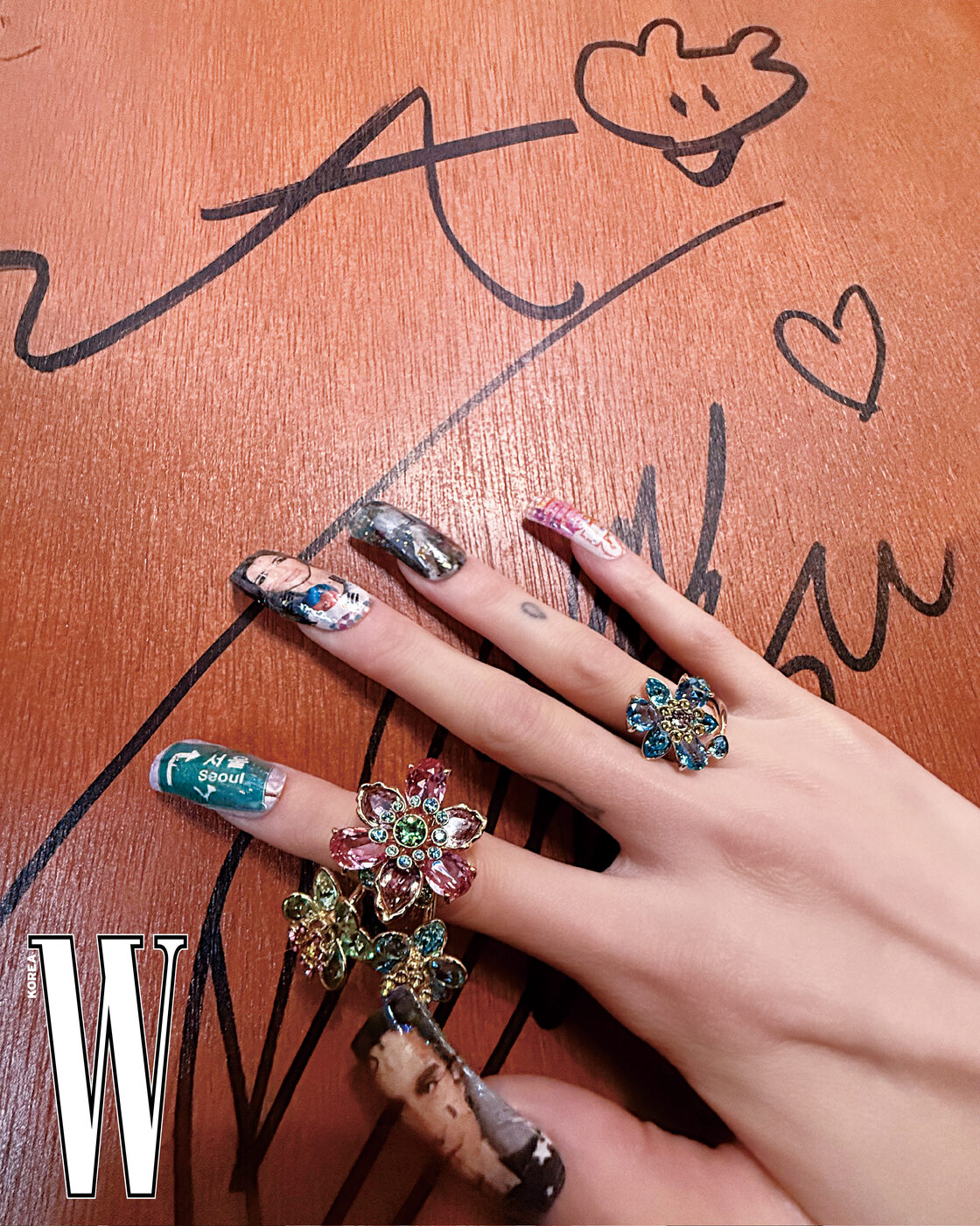 검지와 약지에 낀 꽃 반지는 스와로브스키 제품.