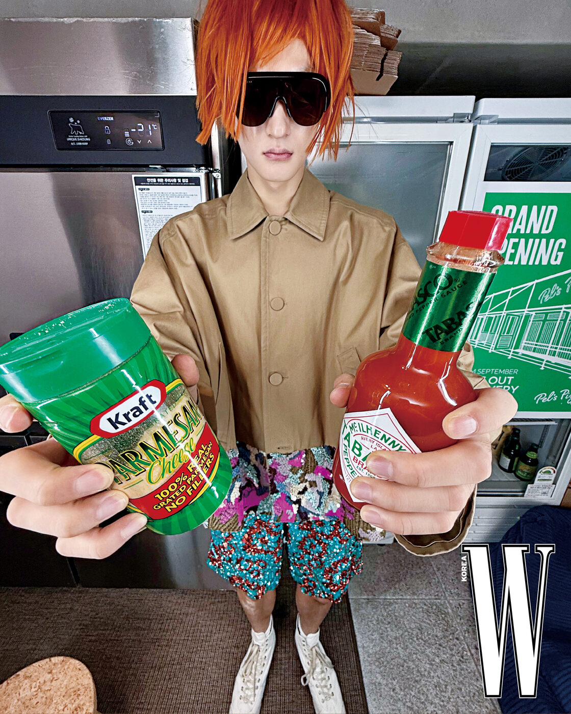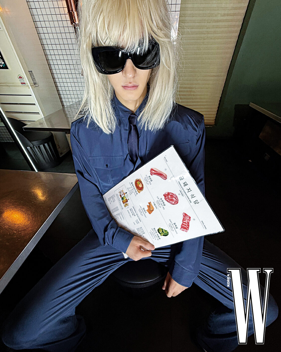 팬츠, 슈즈는 생 로랑 by 안토니 바카렐로 제품.
