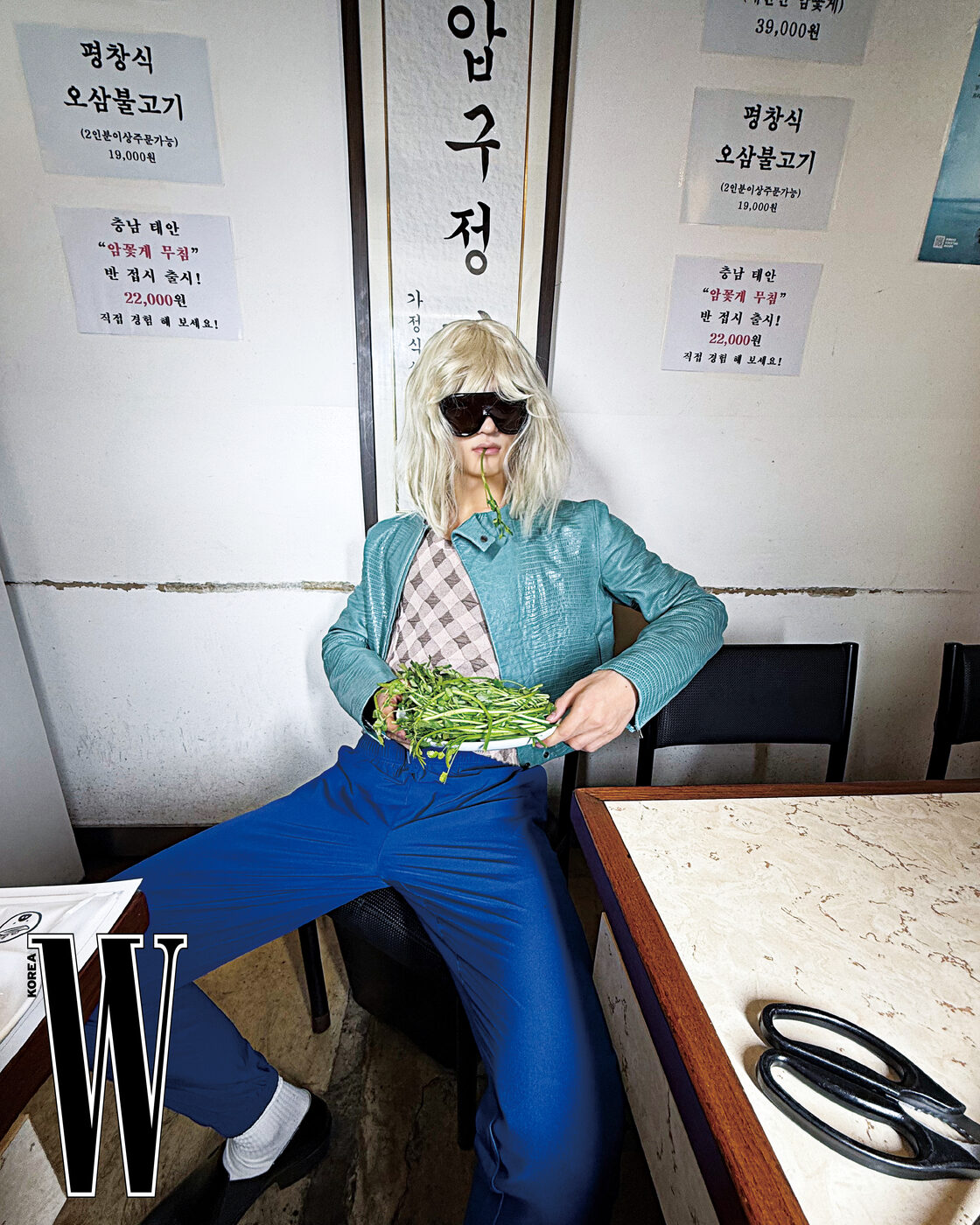 선글라스는 발렌시아가, 프릴 장식 톱, 벨벳 팬츠는 끌로에,