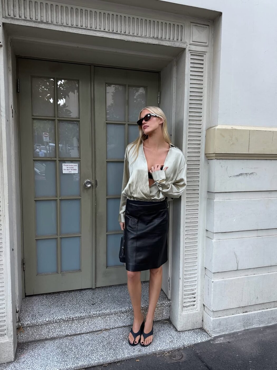 비대칭으로 겹치는 랩 디자인의 미디 스커트는 시선을 분산시켜 체형 보정까지 탁월하니, 여성들의 필수템이 되지 않고는 못 배기겠죠. 차분한 다크 브라운에 은은한 광택의 블루 셔츠, 그리고 뾰족한 앞코의 슬링백이면 출근 룩부터 저녁에 갑자기 잡힌 약속까지 프리패스!
