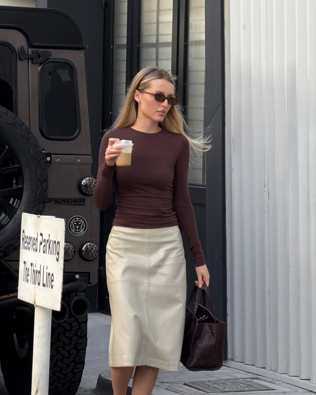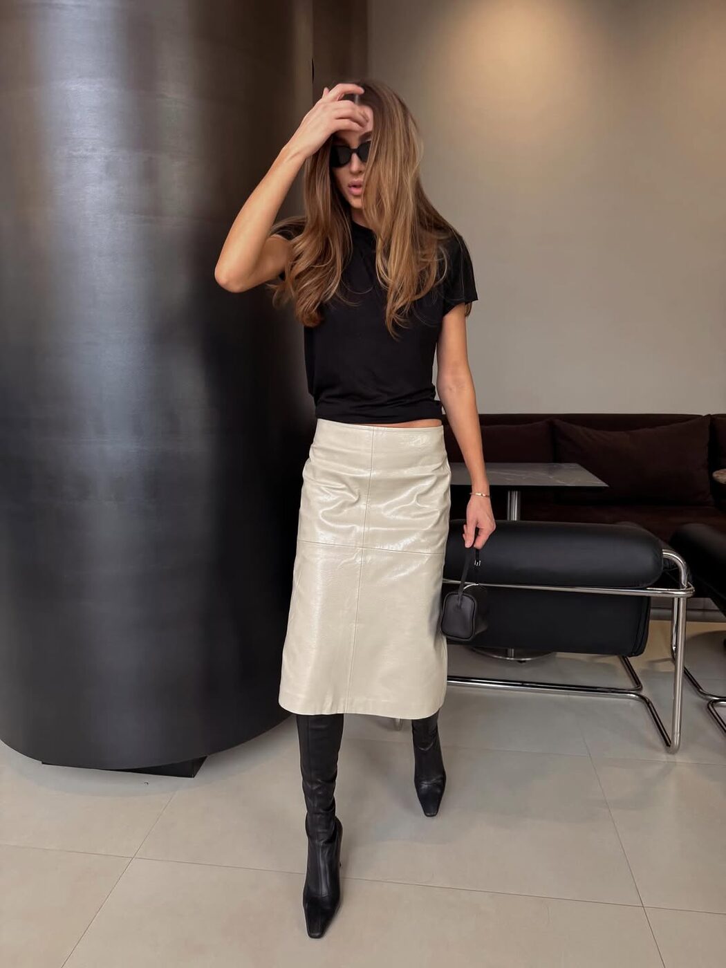 미디스커트가 지루한 오피스 룩으로 전락하지 않으려면 소재의 선택이 관건입니다. 이번 시즌 가장 눈여겨봐야 할 것은 은은한 광택이 감도는 아이보리 레더 미디스커트고요! 은은한 광택이 도는 크림색 레더 미디스커트는 무거워 보이는 가죽 소재의 단점을 덜어내고 세련미만 남기죠. 몸매가 드러나는 타이트한 브라운 톤이나 베이비 블루 같이 화사한 상의를 매치해보세요. 같은 레더 스커트라도 상의의 컬러에 따라 무드는 반전되기 마련이니까요.
