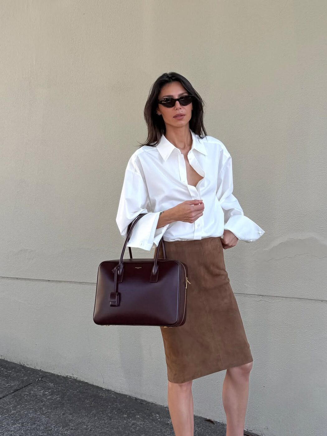 조금 더 클래식한 무드를 원한다면 브라운 컬러의 스웨이드 소재를 택해 보세요. 화이트 셔츠의 소매를 무심하게 걷어붙이고, 단추는 서너개 푸른 다음 묵직한 스웨이드 미디스커트를 더하는 것만으로도 충분히 압도적인 고급스런 분위기를 완성할 수 있습니다.