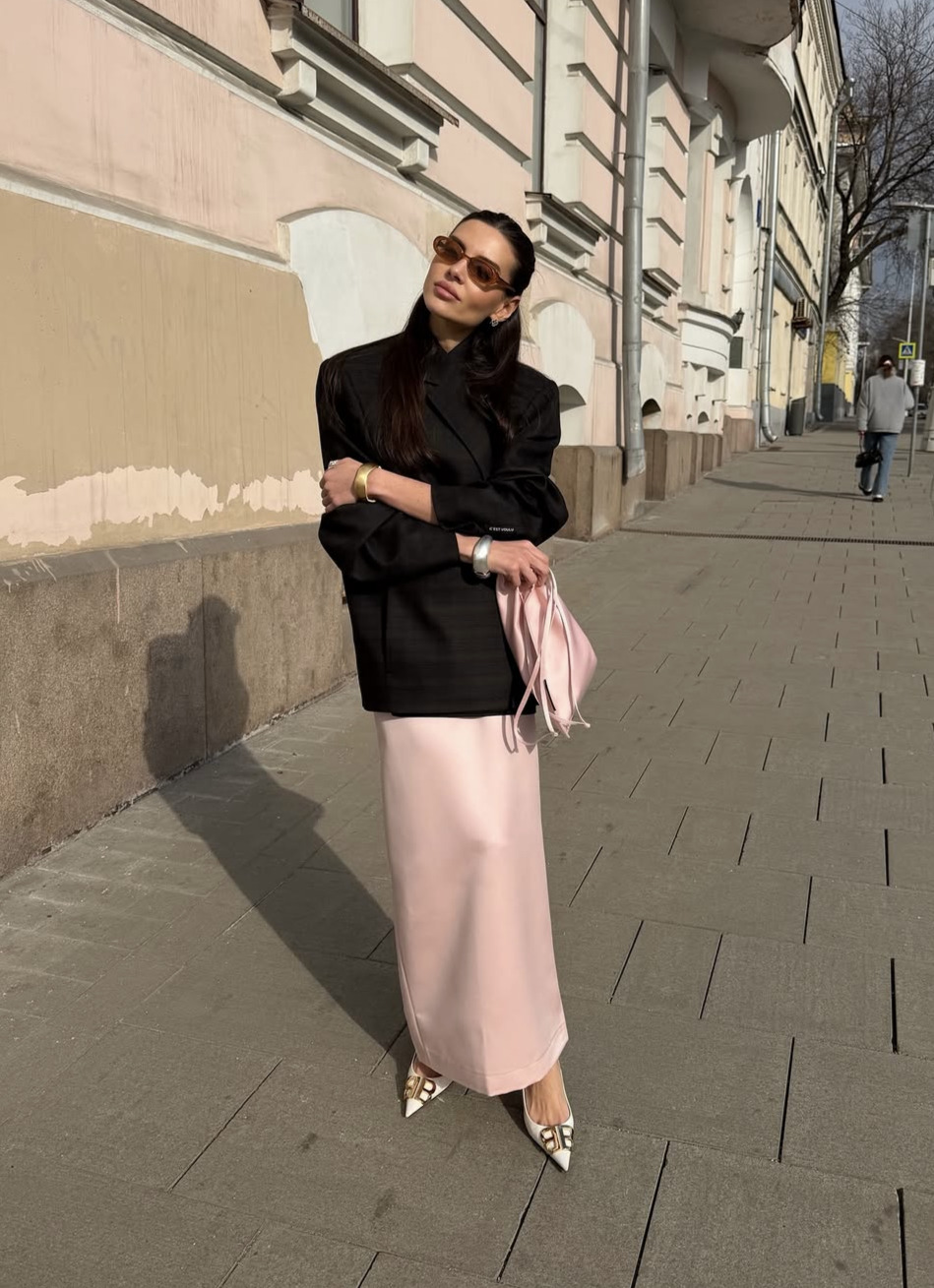 분홍이라고 해서 카리스마가 없는 건 아닙니다. 로맨틱하고 여성스럽기만 할 거란 편견을 버리세요. 심플한 블랙과 함께 한다면 시크하고 파워풀한 모습도 어렵지 않아요. 클래식한 블랙 블레이저 혹은 터프한 블랙 레더 재킷으로 핑크 스타일링을 완성해 보세요. 블랙 슈즈와 백 혹은 핑크 슈즈와 백으로 액세서리를 통일한다면 더욱 세련된 무드를 연출할 수 있답니다.