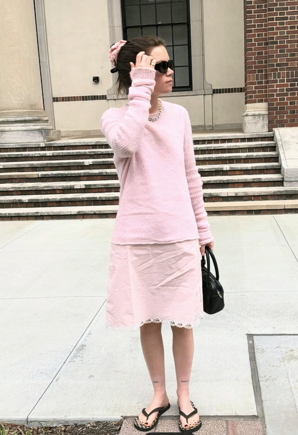분홍과 분홍의 만남이지만 과한 로맨틱함이 느껴지지 않게, 꾸안꾸 무드로 연출해도 좋아요. 핵심은 여성스럽지 않은 실루엣에 있습니다. 밋밋한 오버 핏의 핑크색 니트 톱에 마찬가지로 뻣뻣한 소재의 무심함이 드러나는 미드 스커트를 매치했어요. 라인을 살리는 옷차림이 아닌 그저 툭, 껴입은 듯함이 포인트입니다. 여기엔 블랙 플립플랍과 심플한 블랙 미니백으로 로우 키 감성을 선보였어요.