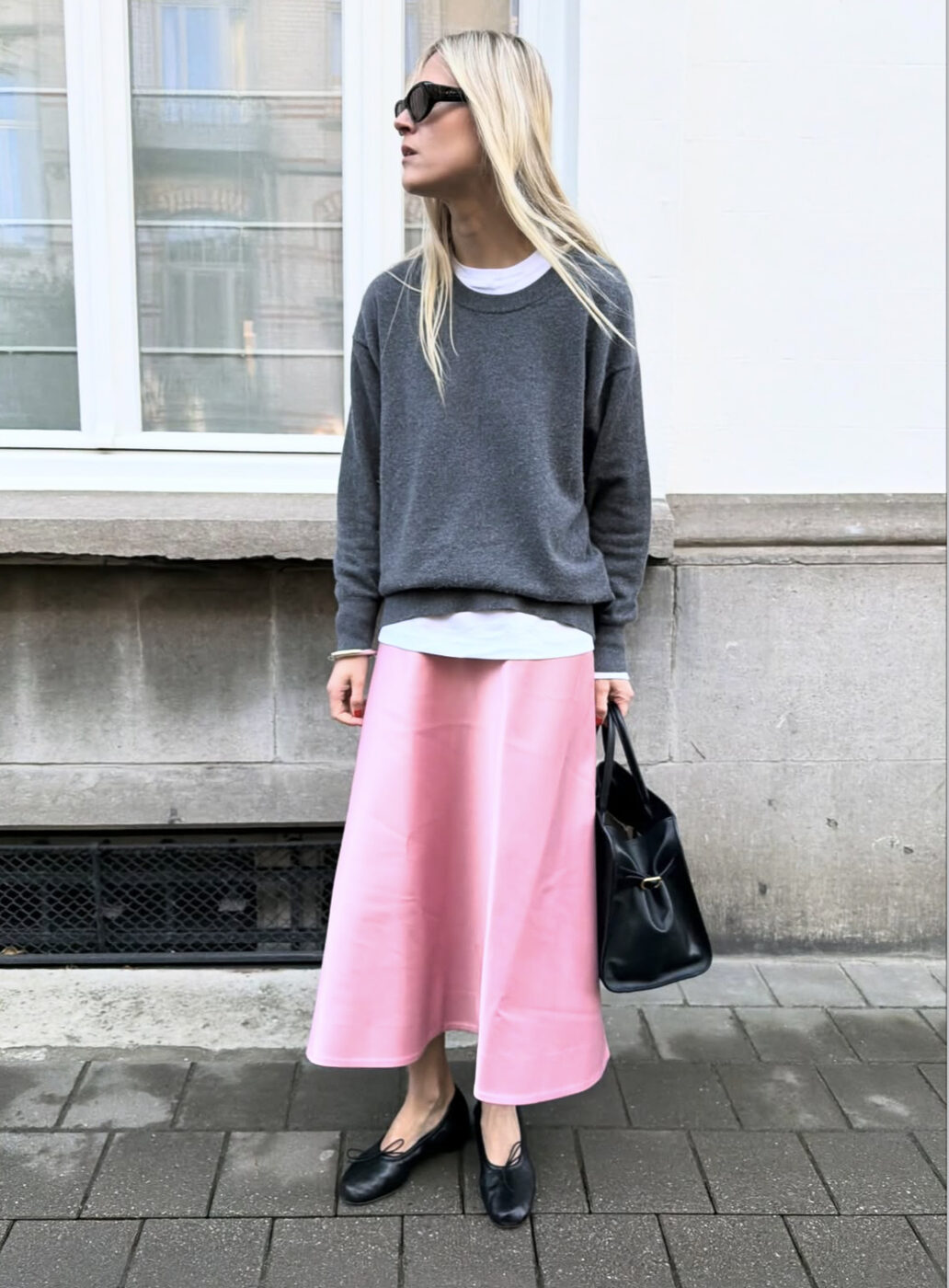 맥시 스커트라 해도 그다지 달라지지 않아요. 핑크에 화려한 장식이나 레이스 디테일을 더하기보다 매니시 무드의 심플한 그레이 니트와 화이트 티셔츠를 매치해 꾸안꾸 룩을 완성했죠. 역시 핑크에 블랙이 있어야 합니다. 블랙 슈즈와 백으로 무게감을 더해줬어요.