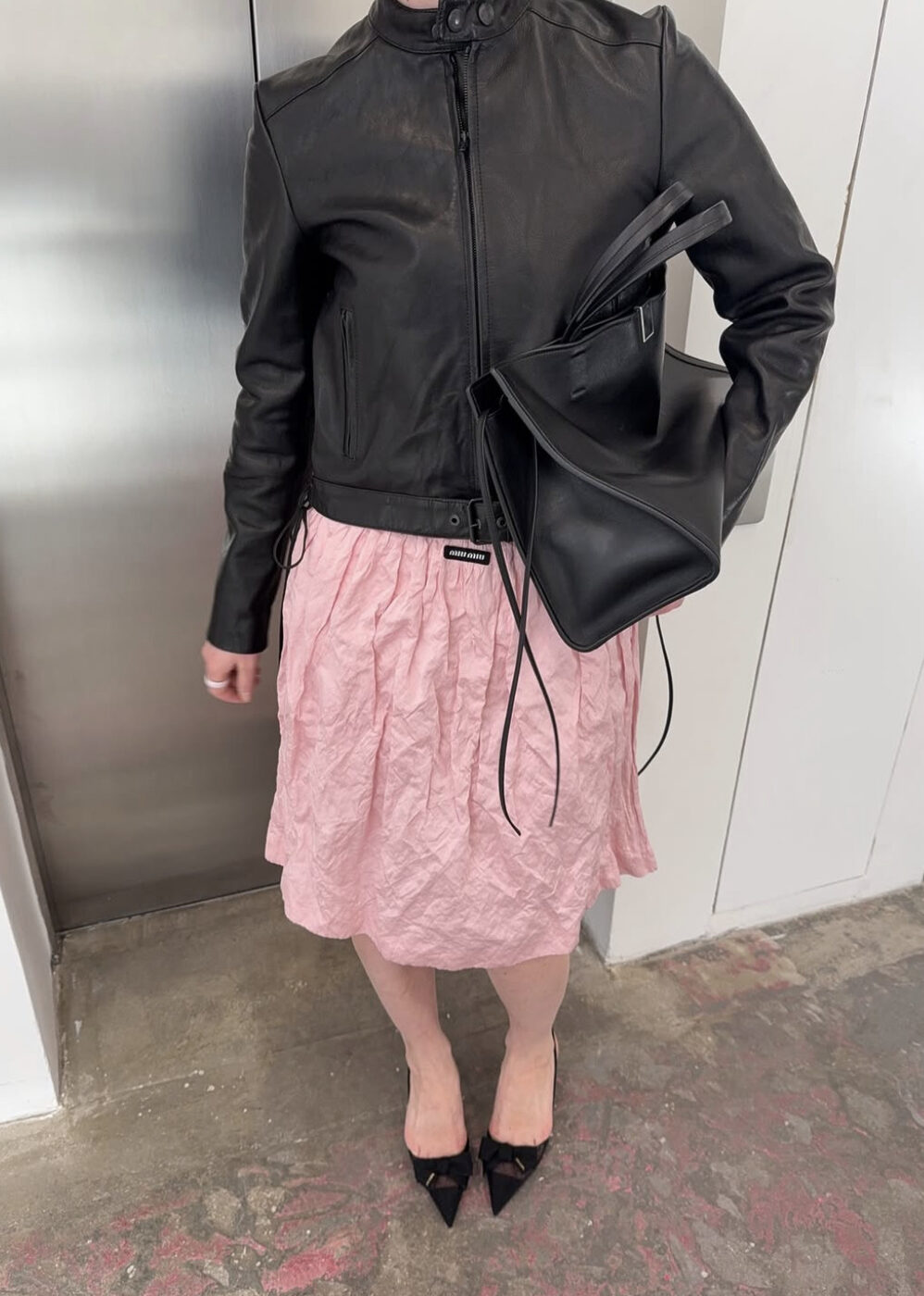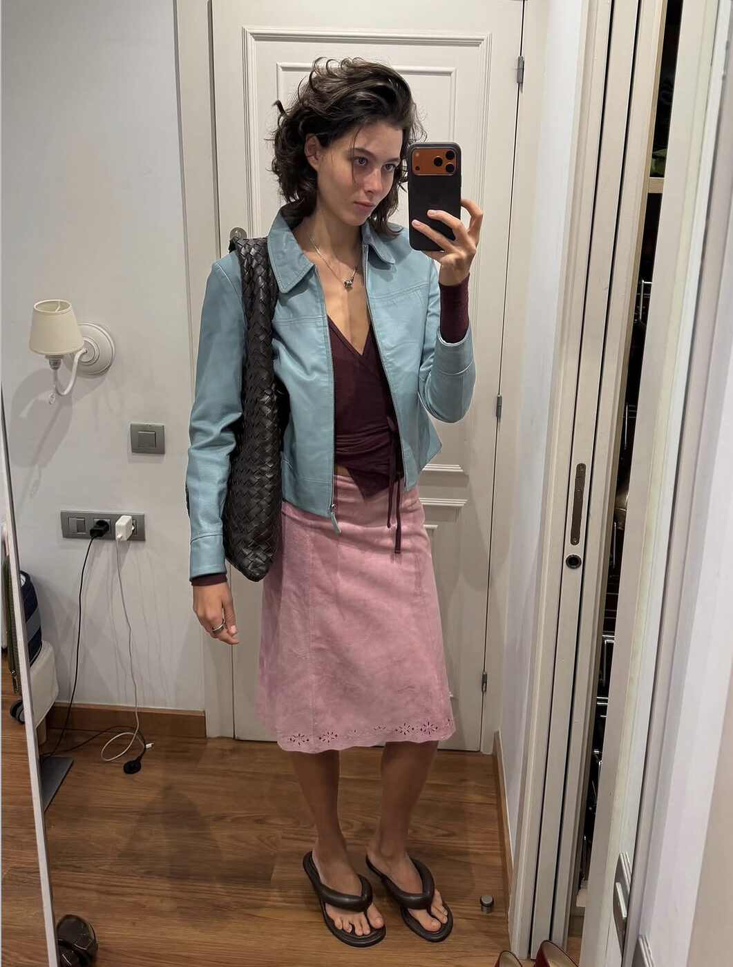 스타일링의 고수라면 빈티지한 분위기의 믹스 매치 룩에 도전해봐도 좋습니다. 핑크색 스웨이드 소재의 스커트가 그 자체로 히피 무드를 선사해요. 여기엔 하늘색의 레더 재킷으로 독특하고 감성적인 빈티지 룩을 완성했어요.