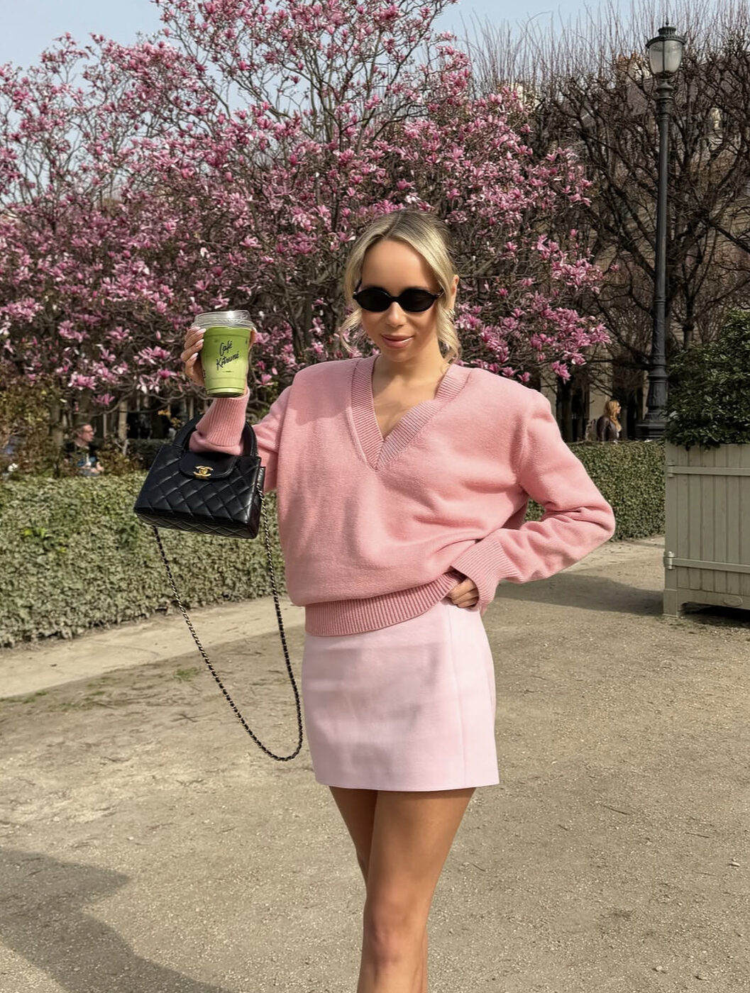 분홍색 벚꽃 나무 아래 한번쯤은 과감한 올 핑크 룩에 도전해 보세요. 세상 여성스러운 색을 쓴다면 실루엣은 단순해야 합니다. 미니멀한 브이넥 라인의 니트 톱에 네모 반듯한 분홍색 미니 스커트로 로맨틱 지수를 높였어요. 마무리는 블랙 백과 선글라스로 시크함 한 스푼을 더했어요.
