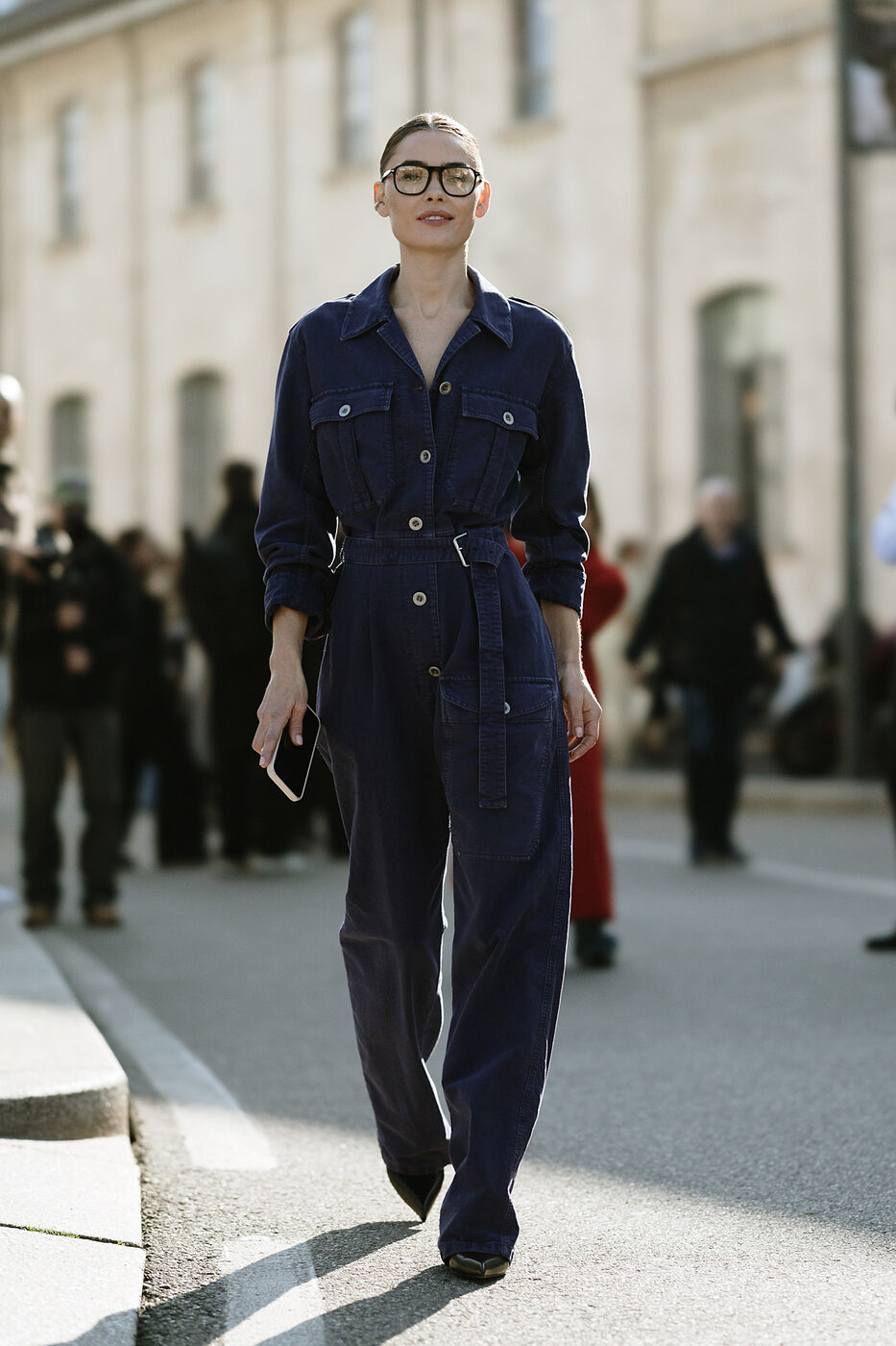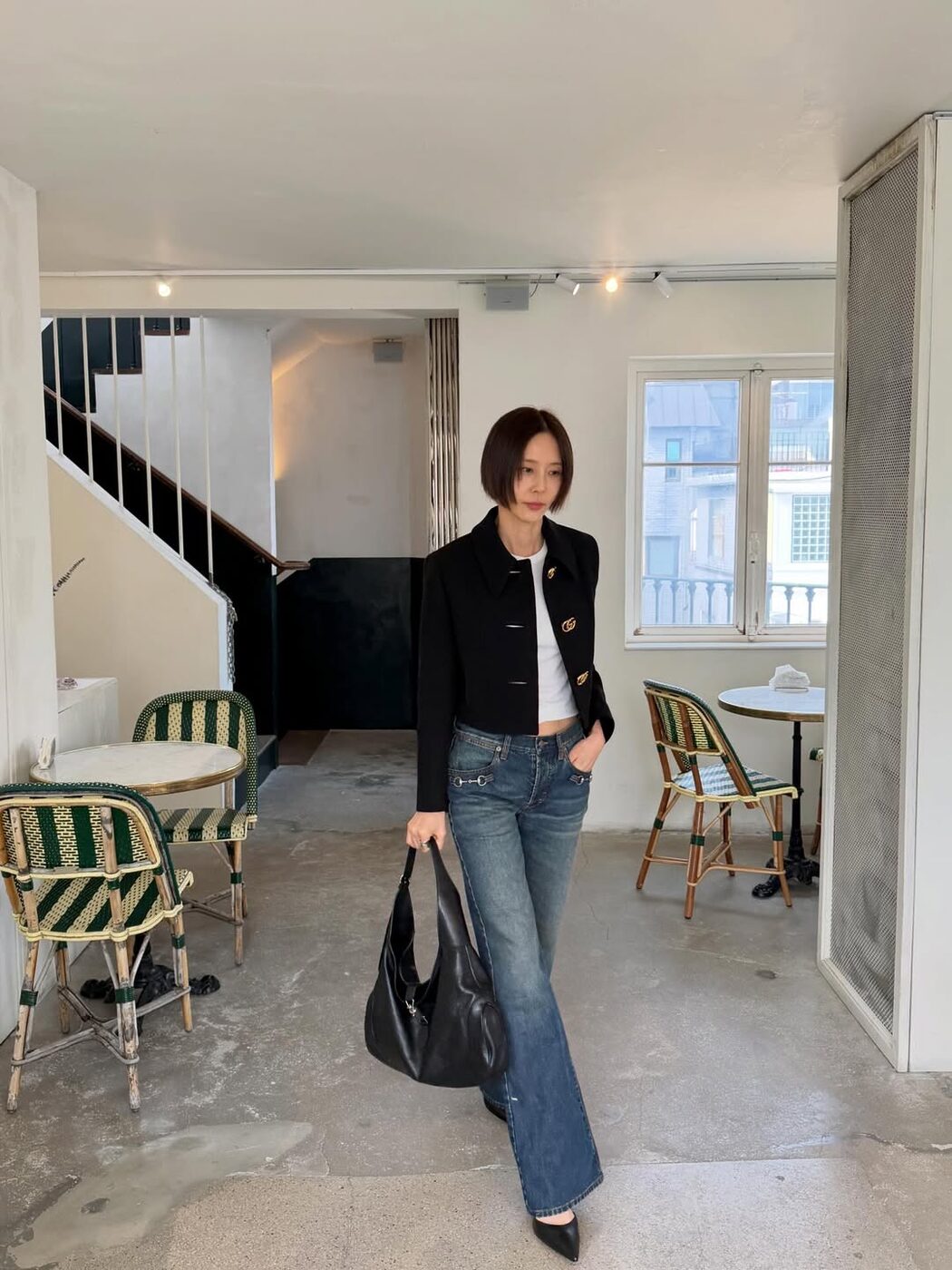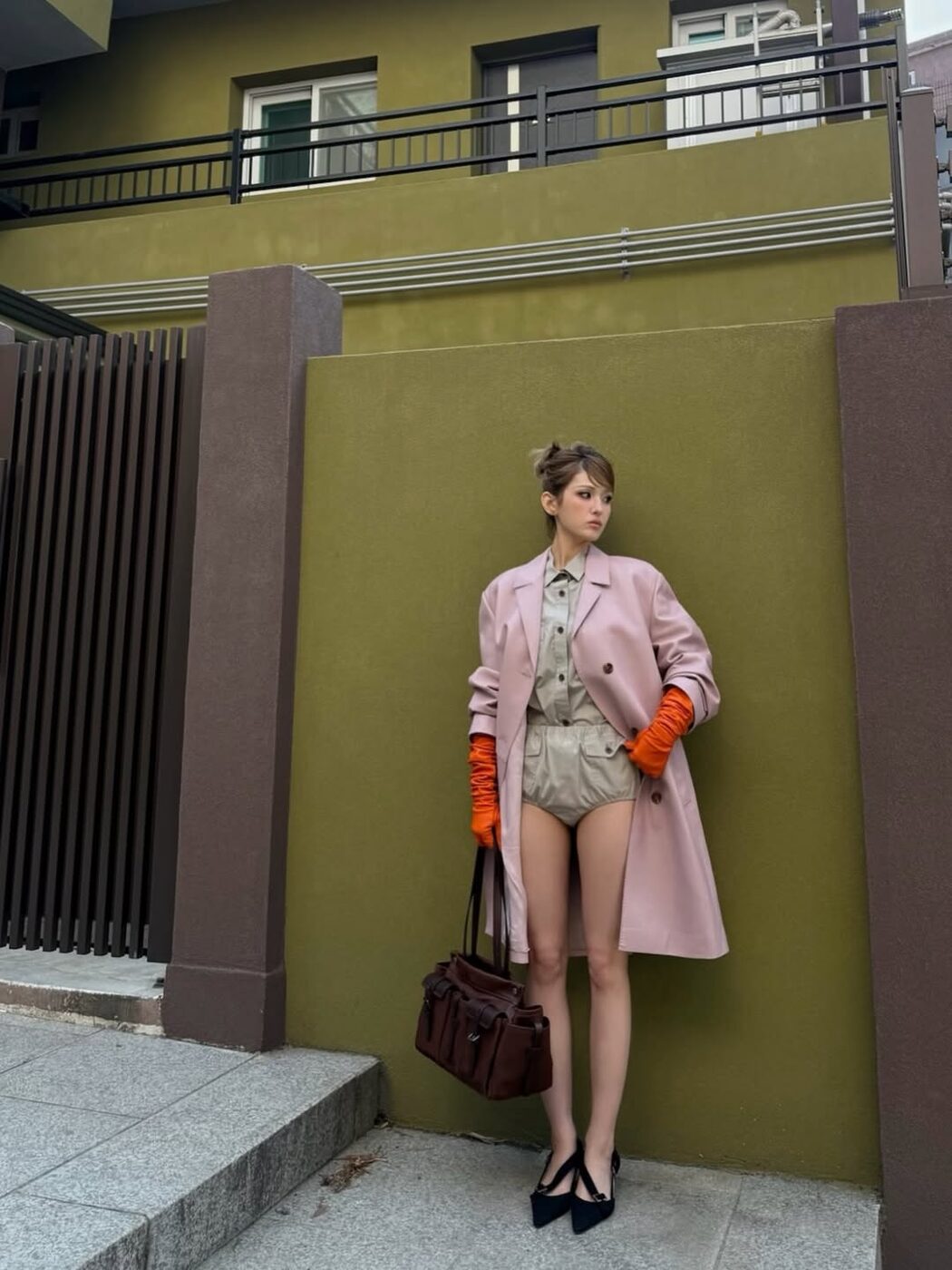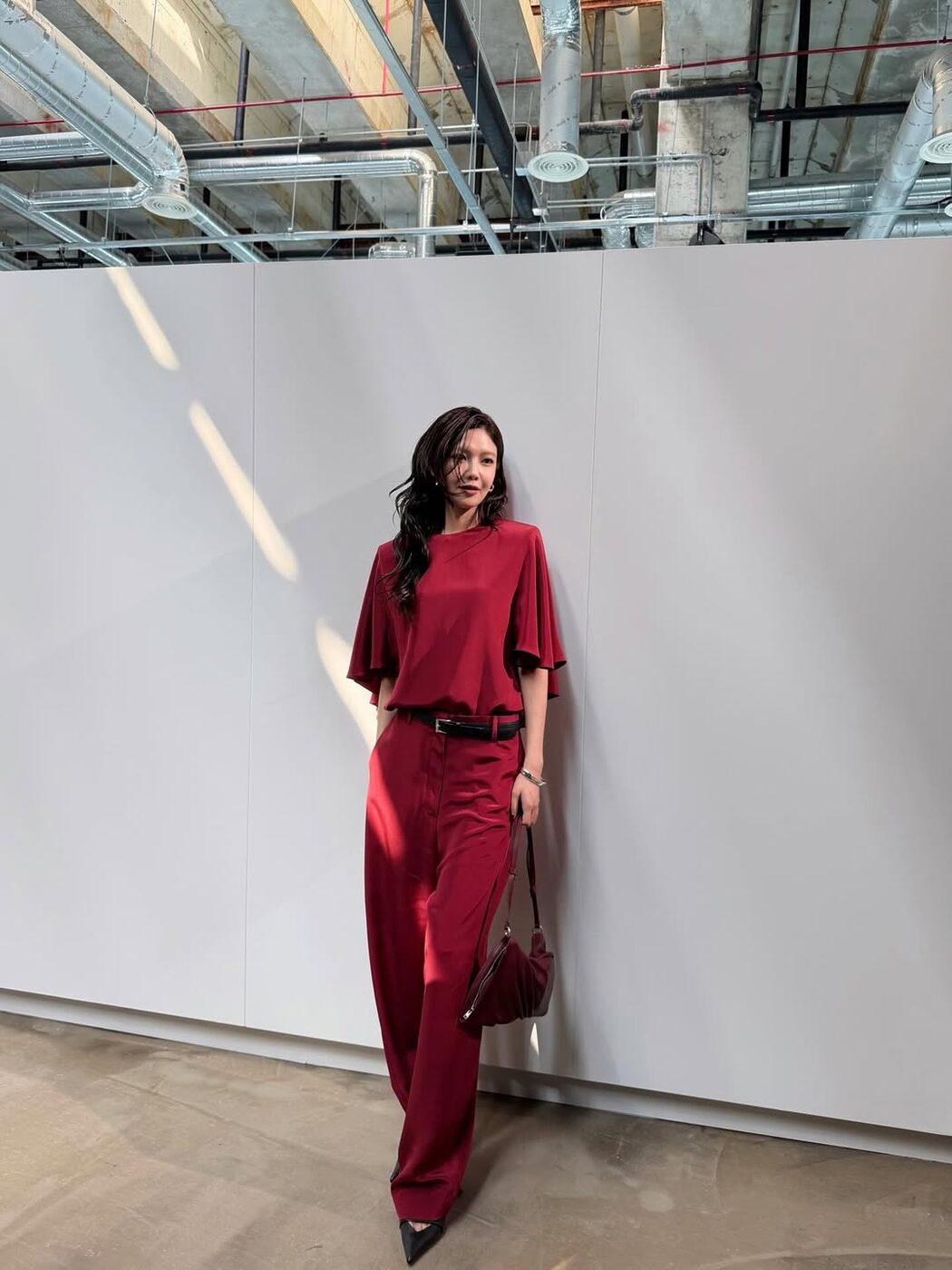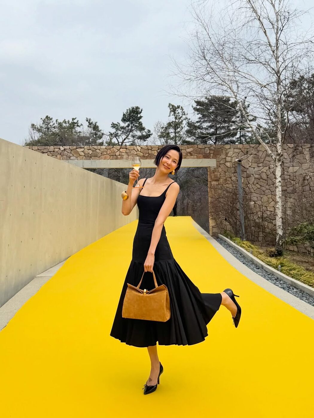 점프슈트와 같이 캐주얼한 의상을 입을 때 대부분 운동화나 워커부츠를 신을 텐데요. 루스한 오버 실루엣의 의상은 자칫 둔해 보이거나 부해 보일 수 있어 포인티드 토 슈즈로 전체적인 룩의 라인을 정돈해 주는 것이 좋아요. 오버핏 의상일수록 플랫 슈즈보다는 카리나처럼 적당한 굽이 있는 포인티드 토 힐을 선택해, 바지 밑단 아래 에지 있는 앞코를 드러내는 것이 보다 더 스타일리시한 느낌을 줄 수 있습니다.