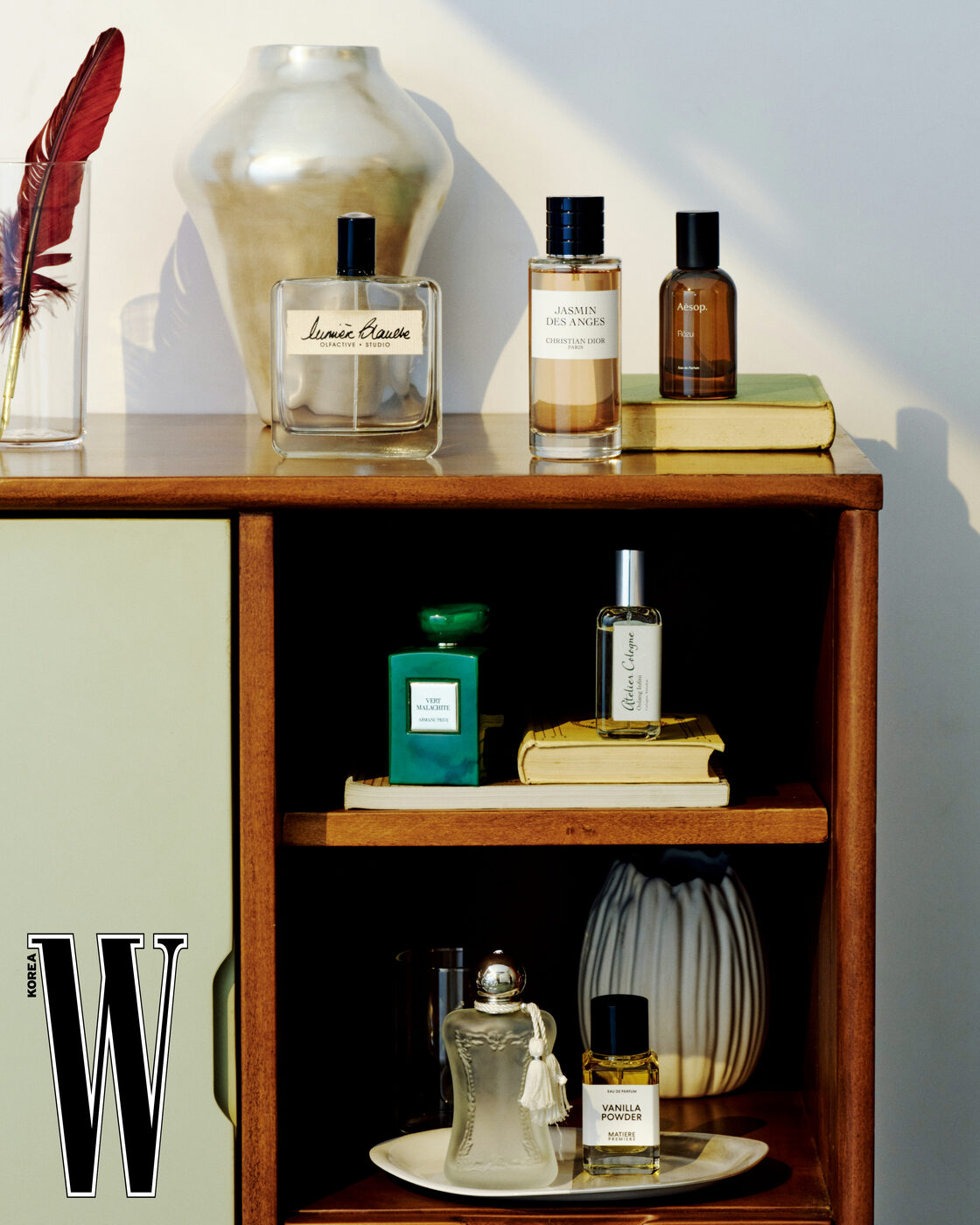 그날의 향기를 고르는 나만의 철학은? 중요한 미팅이 있는 날 갑옷처럼 두르는 ‘전투용’ 향, 습도가 높고 끈적이는 날을 위한 시트러스, 화이트 셔츠와 어울리는 깨끗한 향 등 외출 직전 향을 고를 수 있도록 현관에 몇십 가지의 향수를 놓아둔다. 비슷한 무드의 향수끼리 모아두고 어떤 기분으로 하루를 시작하고 싶은지, 어떤 모습으로 하루를 보내고 싶은지를 생각하며 향수를 택한다.
