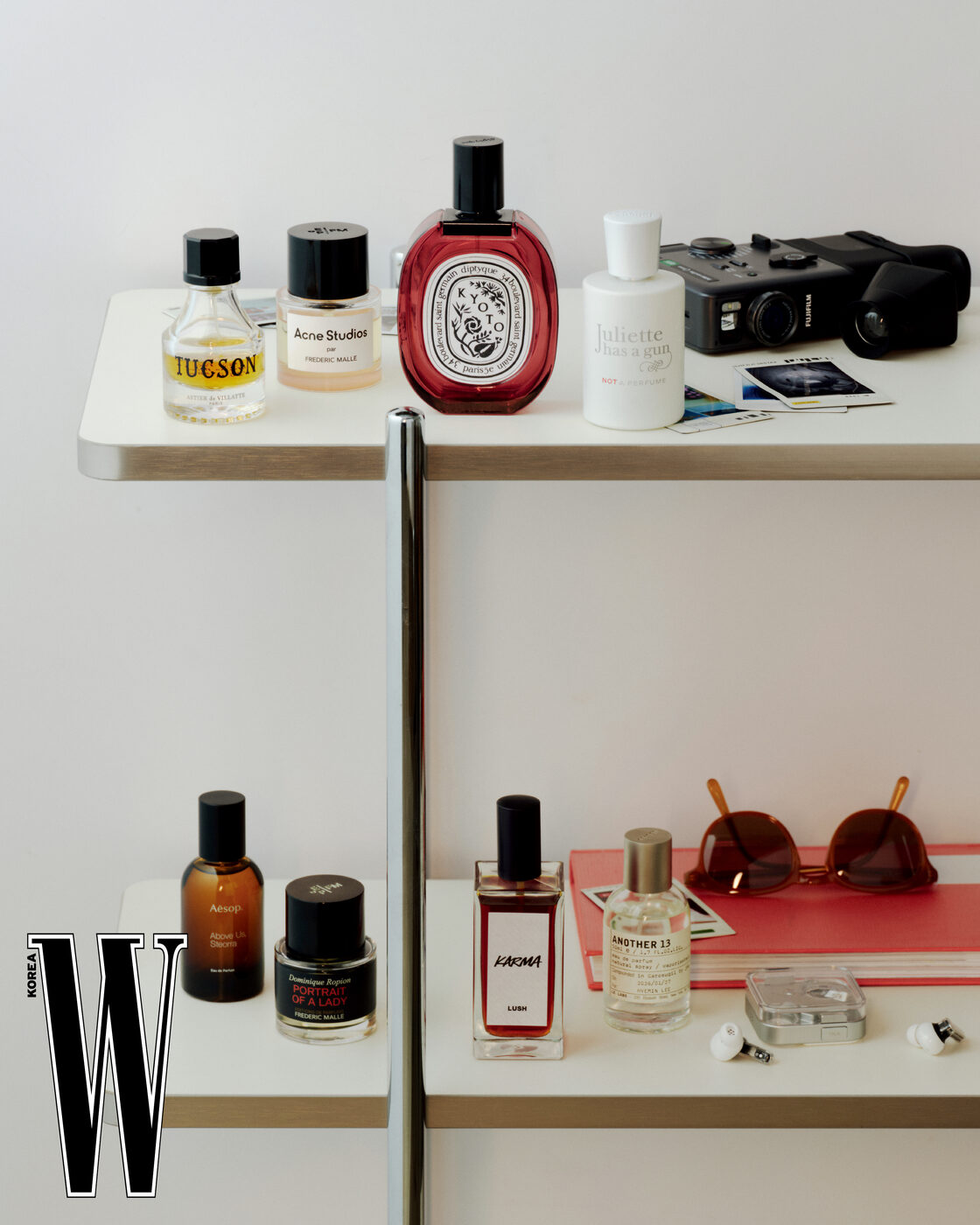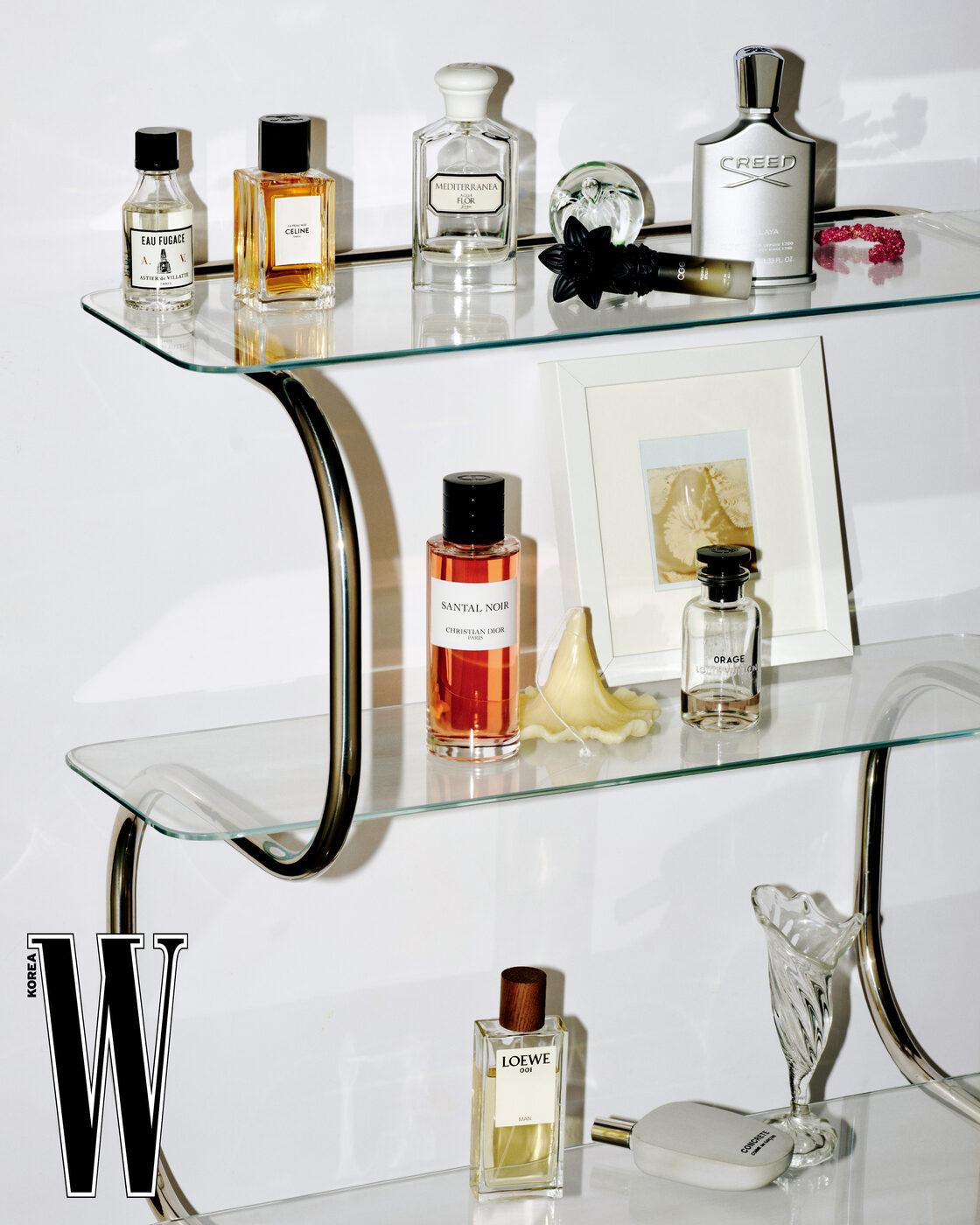 향을 고르는 나만의 철학은? 정리정돈을 잘하는 편은 아니다. 대신 외출 준비를 마친 직후, 바로 손이 닿는 위치에 향수들을 두는 편이다. 그날 입은 옷, 만 나게 될 사람들을 떠올리며 향을 고른다. 향수를 구매하고 받은 작은 샘플 여러 개를 가방 안에 늘 휴대하고, 사무실 책상과 차 안, 집 안 곳곳에 향수를 일상적으로 두고 3~5가지의 향수를 레이어링하곤 한다. 동일한 브랜드의 다른 향수를 여러 개 섞어 뿌리는 것도 좋아한다.