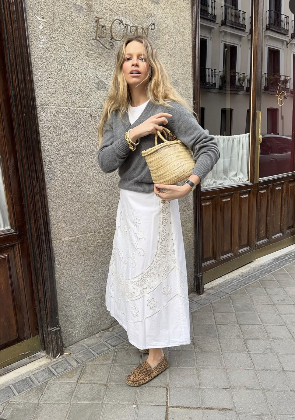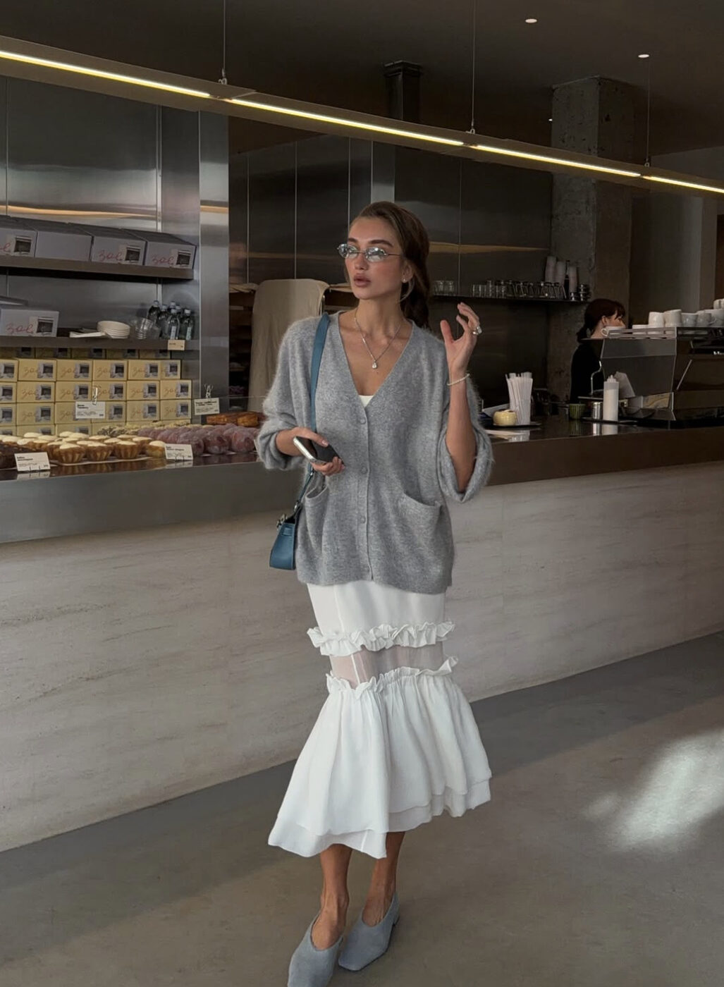 회색 니트를 더 밝은 분위기로 입고 싶다면 무조건 화이트와 함께 입으세요. 코티지 코어 풍의 자수와 레이스 장식의 화이트 풀 스커트와 이너에 화이트 톱을 입고 브이넥의 기본 회색 니트를 입었어요. 차분하고도 감성적인 스프링 룩, 손쉽게 완성할 수 있답니다.