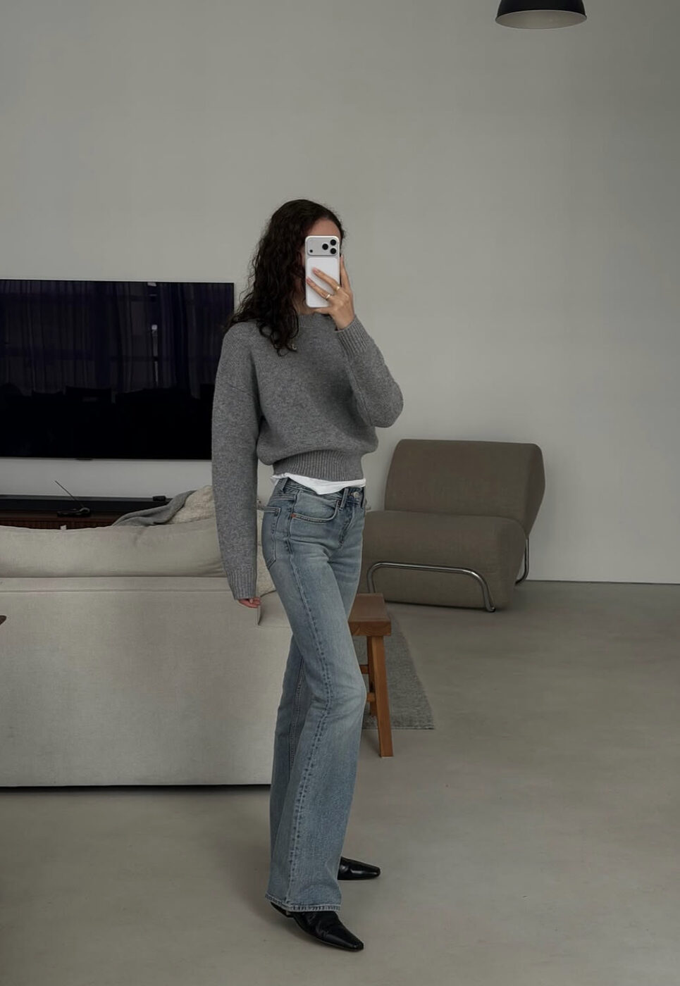 청바지와 회색 니트, 듣기만해도 지겨울 법한 이 조합이 아주 세련된 자태를 자랑합니다. 바로 실루엣 덕분인데요. 니트는 허리를 잡아주는 크롭 스타일로, 청바지는 빈티지 무드의 부츠컷으로 슬림하고 길어 보이는 라인을 선보였어요. 여기에 니트 밖으로 슬쩍 나온 화이트 티셔츠와 블랙 포인티드 슈즈가 엣지를 더했죠.