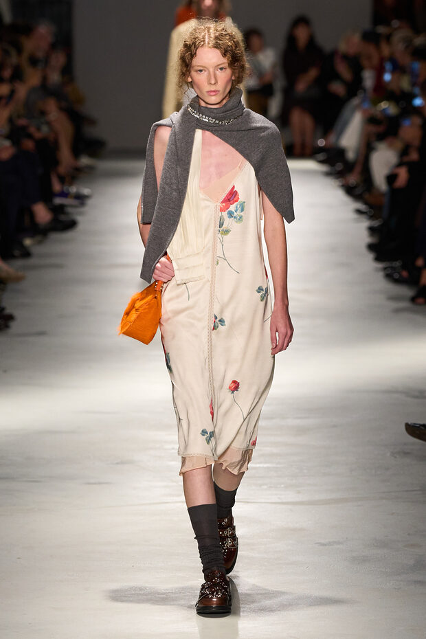 런웨이 위에서는 이 니트를 스카프 혹은 숄처럼 사용한 N21의 봄, 여름 컬렉션을 주목하세요. 지금부터 입기 좋은 서머 슬립 드레스 위에 기본 회색 니트를 어깨에 걸쳐 주었어요. 그 방식 또한 독특합니다. 소매의 매듭을 앞이 아닌 어깨 옆으로 돌려 언밸런스한 매력을 선사했죠. 이 니트는 그대로 드레스 위에 입어도 자유로운 무드의 꾸안꾸 룩이 완성됩니다. 이토록 다방면으로 쓰이는 그레이 니트, 뻔하다 생각해도 안 입을 수가 없어요.