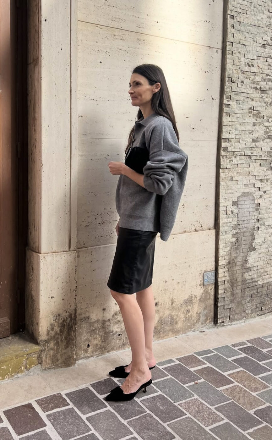 비즈니스 룩으로도 손색없을 그레이와 블랙의 만남. 살짝 오버 핏의 그레이 니트에 블랙 펜슬 스커트를 매치하면 어렵지 않게 성숙하고 시크한 분위기를 낼 수 있답니다. 슬림한 뮬 힐과 클러치 백이 우아한 드레스업 무드를 연출했어요.