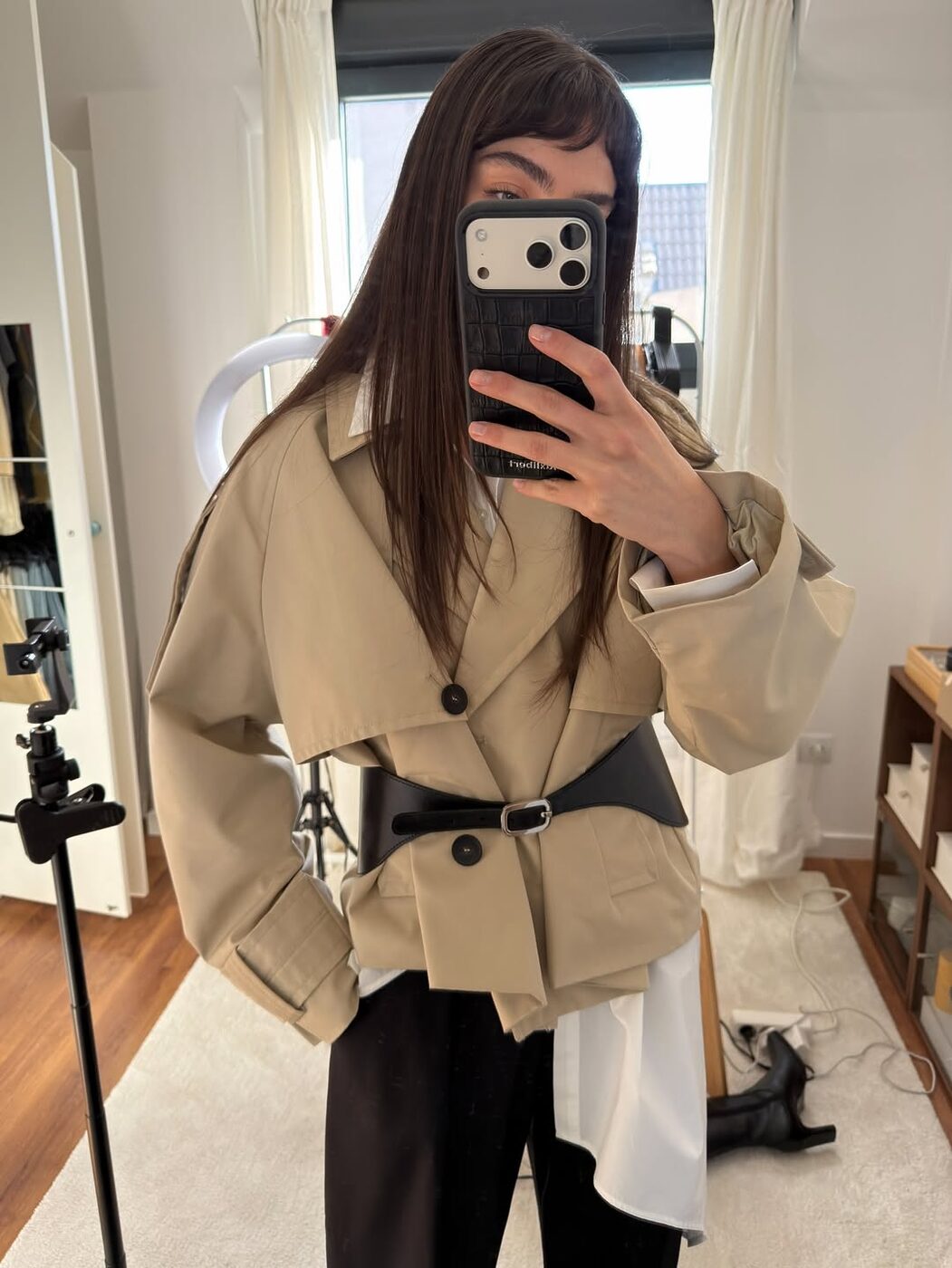 인스타그램에서 요즘 가장 자주 포착되는 아우터 중 하나는 단연 숏 트렌치 재킷입니다. 재킷을 더 다채로운 무드로 즐기고 싶다면 알리 제레즈의 아웃핏을 참고해 보세요. 그녀는 이토록 클래식한 아우터 위에 코르셋 벨트를 레이어드해 누구나 예상 가능한 스타일링을 가볍게 지나쳤습니다. 빅 벨트에 도전해 보고 싶지만 지나치게 화려한 디자인이 부담스럽다면 그녀처럼 작은 사이즈의 버클과 널찍한 면적을 자랑하는 코르셋 벨트를 선택해 보세요. 과한 디테일 없이도 허리 라인을 또렷하게 잡아주며 훨씬 더 모던하고 정제된 아웃핏으로 즐길 수 있습니다.