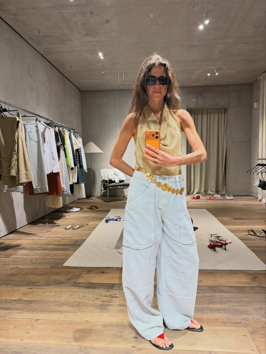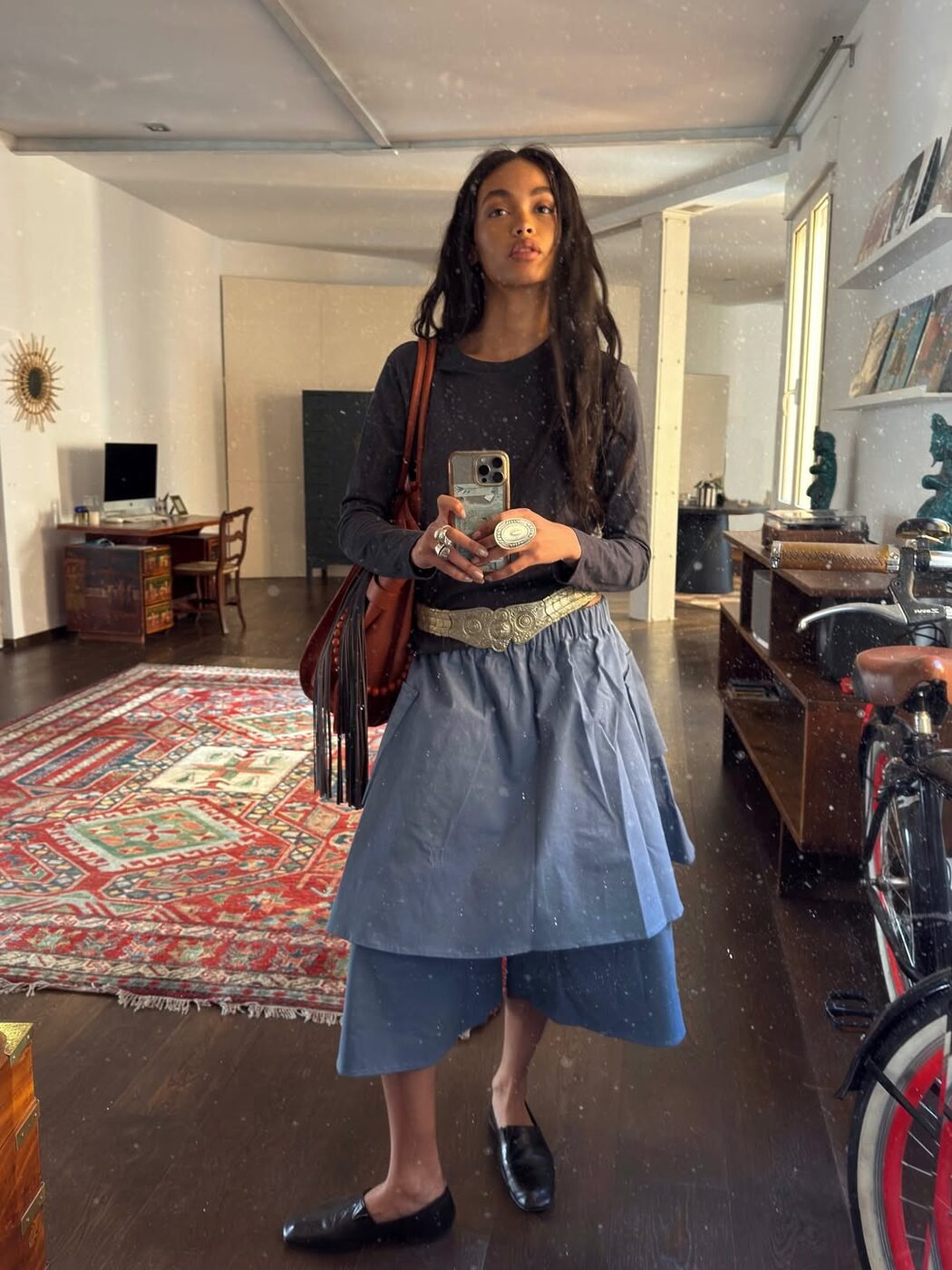 이제 벨트는 더 이상 실용적인 액세서리에 머물지 않습니다. 반지나 네크리스처럼 익숙하게 즐겨오던 주얼리의 영역이 자연스럽게 허리로 확장된 셈이죠. 전형적인 레더 벨트를 넘어 골드 디테일이나 보석 참이 장식된 디자인이 다양하게 등장하면서 벨트 자체가 룩의 중심이 되는 시대가 됐습니다. 특히 이런 주얼 벨트는 에스닉한 무드가 짙어 빈티지한 보호 시크 스타일링에 더없이 잘 어울립니다. 잊지 말아야 할 점은 너무 정직하게 허리에 고정하지 않는 것! 살짝 흘러내리듯 느슨하게 걸쳐야 특유의 무심하고 자유로운 분위기가 살아나 훨씬 더 트렌디한 인상으로 이어집니다.