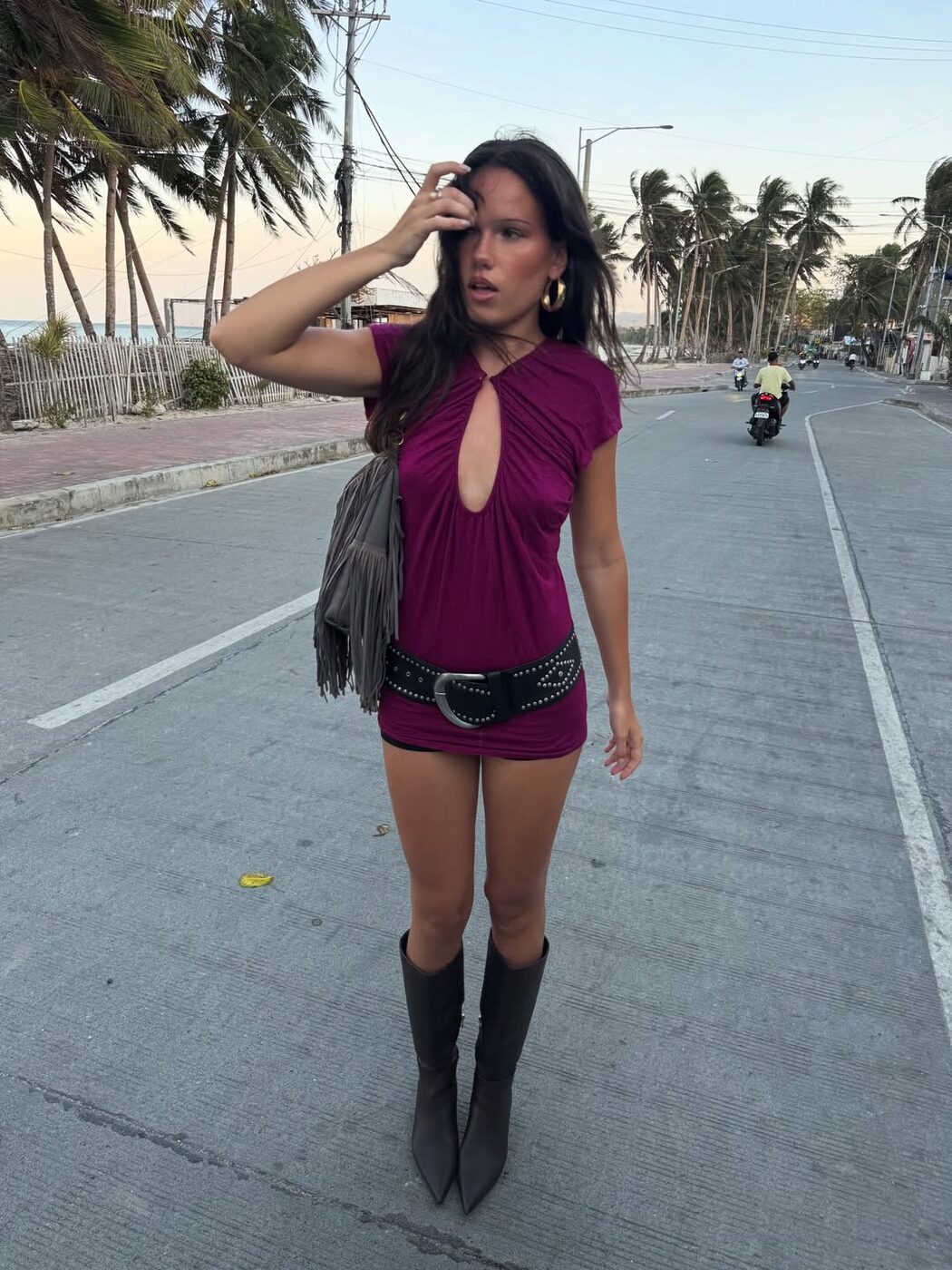 슬림한 라인의 저지 드레스나 H 라인 스커트는 몸의 굴곡이 그대로 드러나는 만큼 자칫 무드가 지나치게 섹시하거나 페미닌하게 흐르기 쉽습니다. 바로 이럴 때 터프한 존재감의 빅 벨트가 탁월한 균형추가 되어주죠. 룩에 힘 있는 포인트를 더하면서도 여성스러운 분위기를 자연스럽게 중화해 훨씬 더 쿨한 아웃핏으로 방향을 틀어줍니다. 특히 보디를 따라 더해진 스터드 장식이라면 그 효과가 극대화되죠.