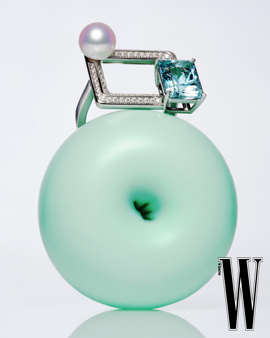 화이트 골드에 아코야 진주, 아쿠아마린, 다이아몬드를 세팅한 링키지 링은 Tasaki 제품.