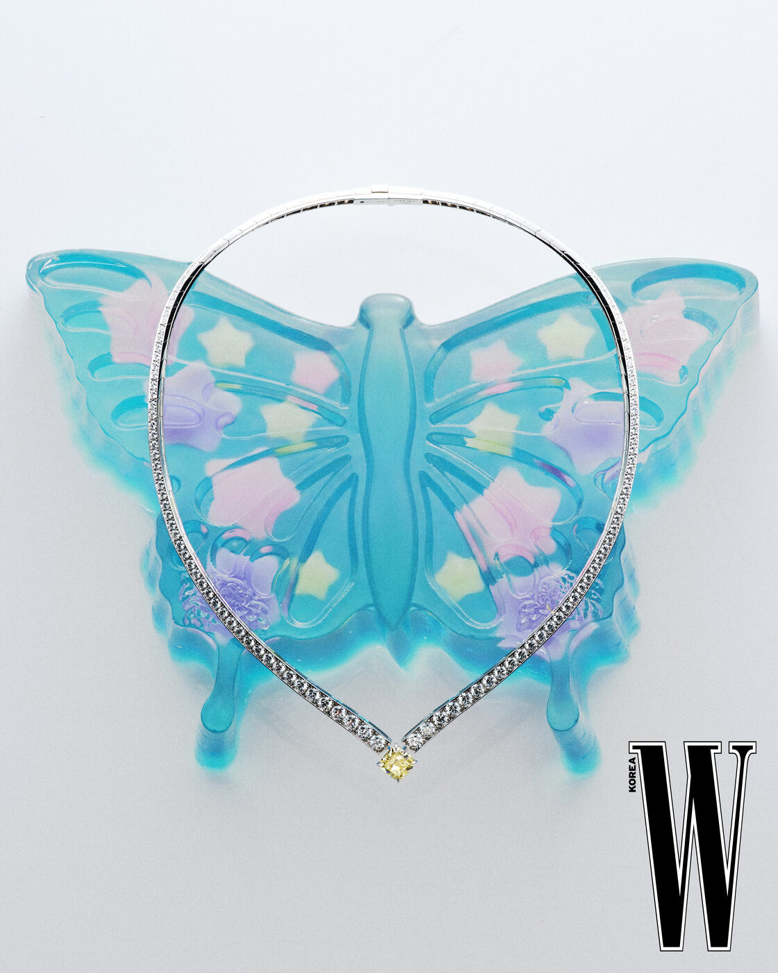 화이트 골드에 옐로 다이아몬드와 브릴리언트 컷 다이아몬드를 세팅한 조세핀 에끌라 플로럴 옐로 다이아몬드 네크리스는 Chaumet 제품.