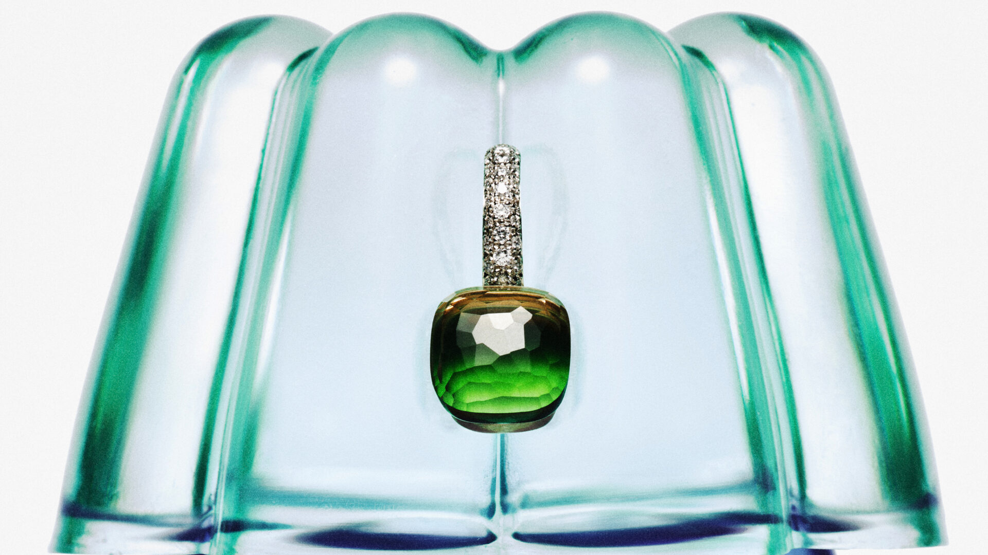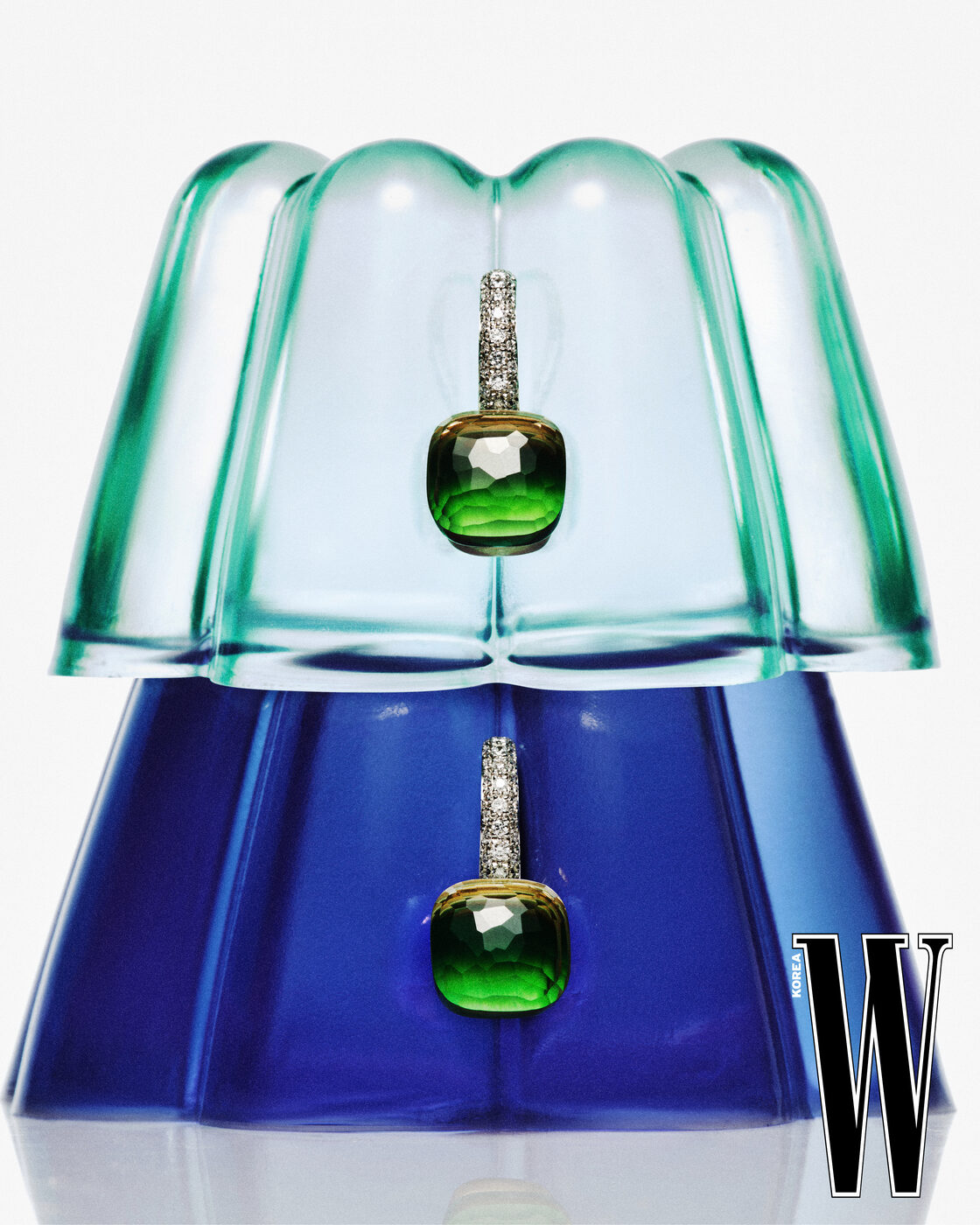 화이트 골드, 로즈 골드에 프레지올라이트와 그린 아게이트, 다이아몬드를 세팅한 누도 이어링은 Pomellato 제품.