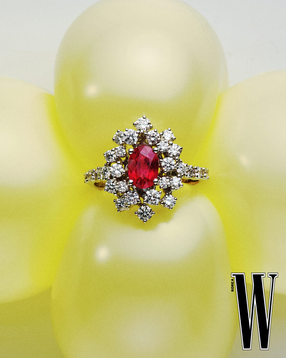화이트 골드에 루비와 다이아몬드를 세팅한 미모사 링은 Damiani 제품.