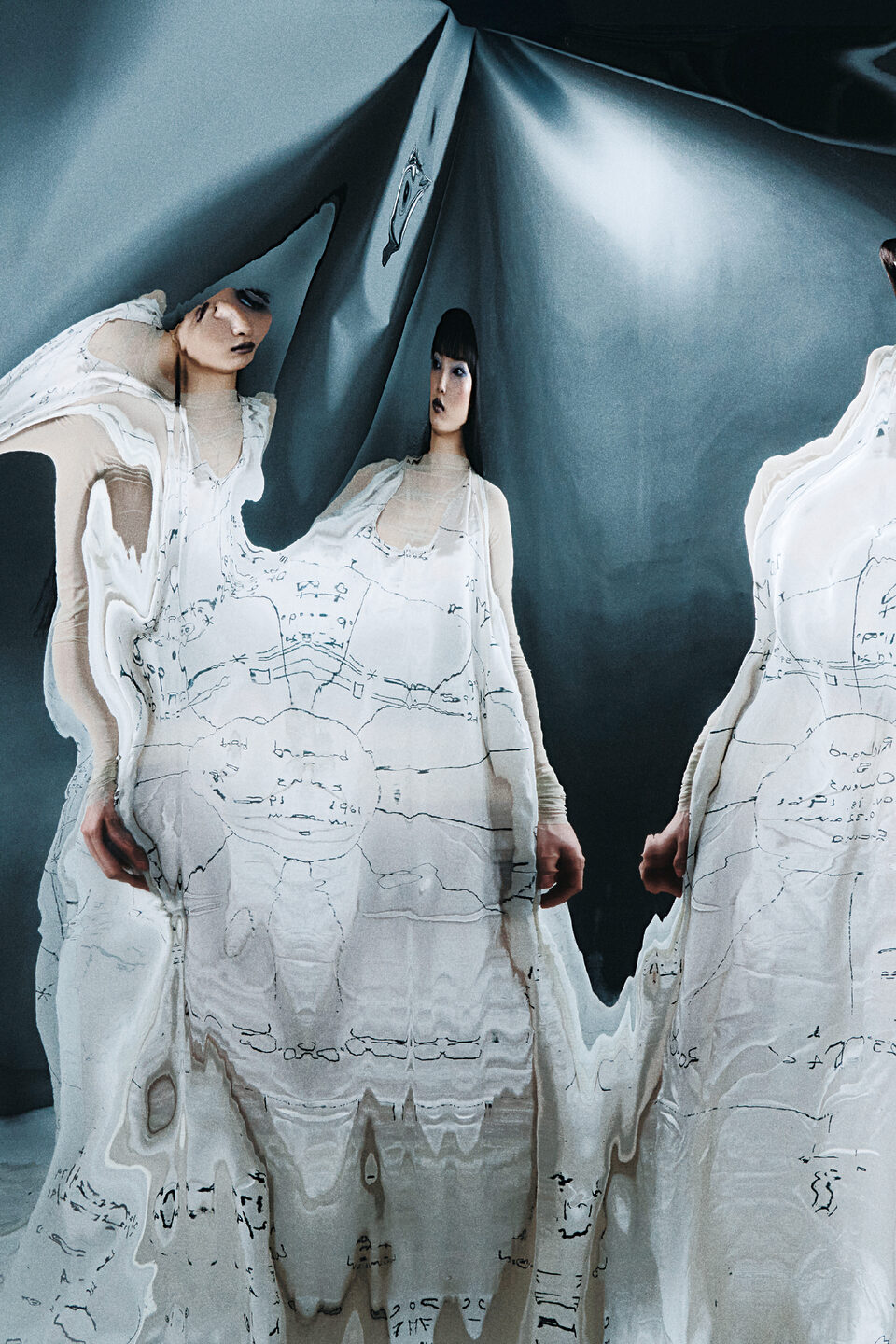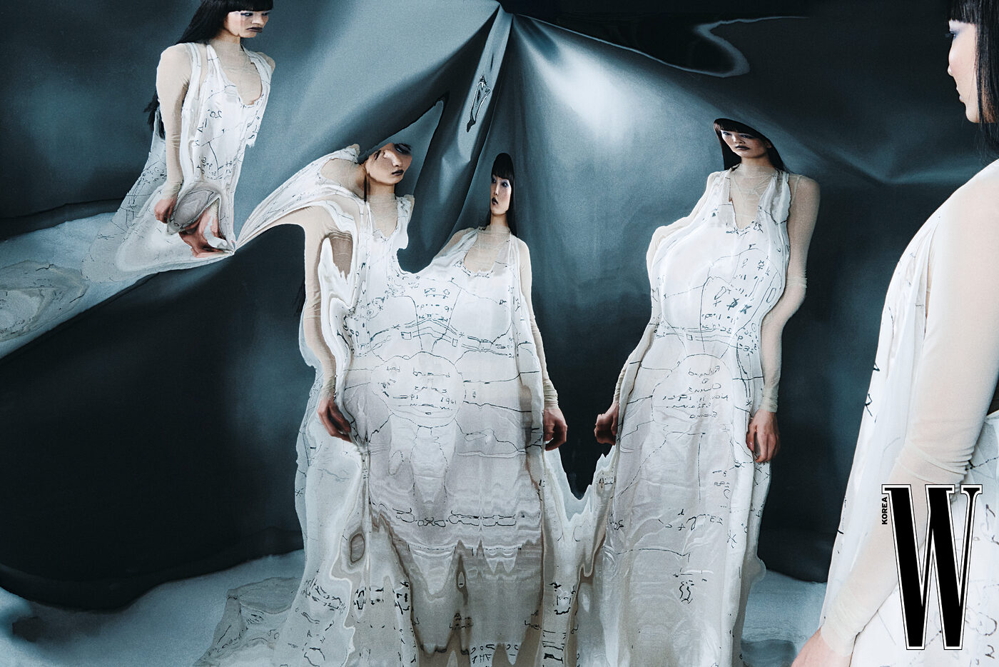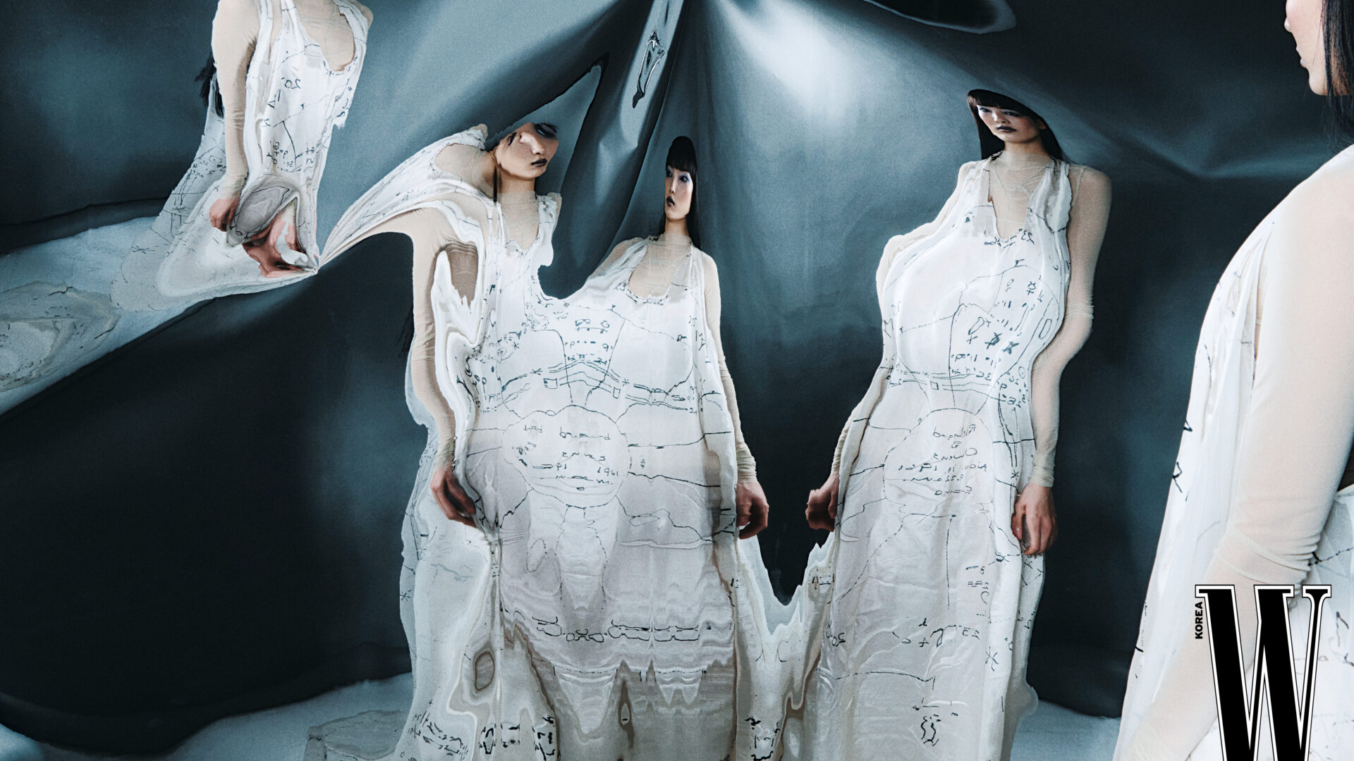 고대 철학의 다이어그램을 연상시키는 드레스와 톱은 Rick Owens 제품.
