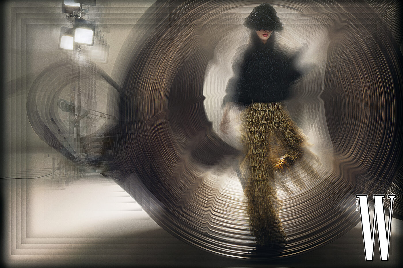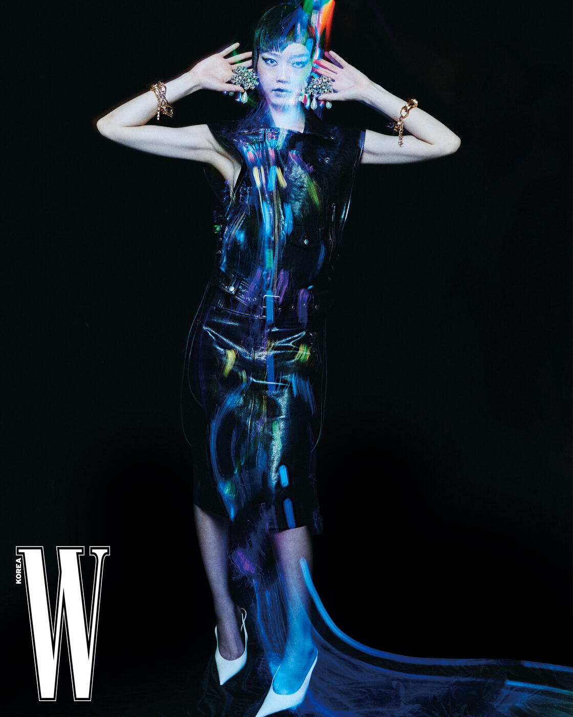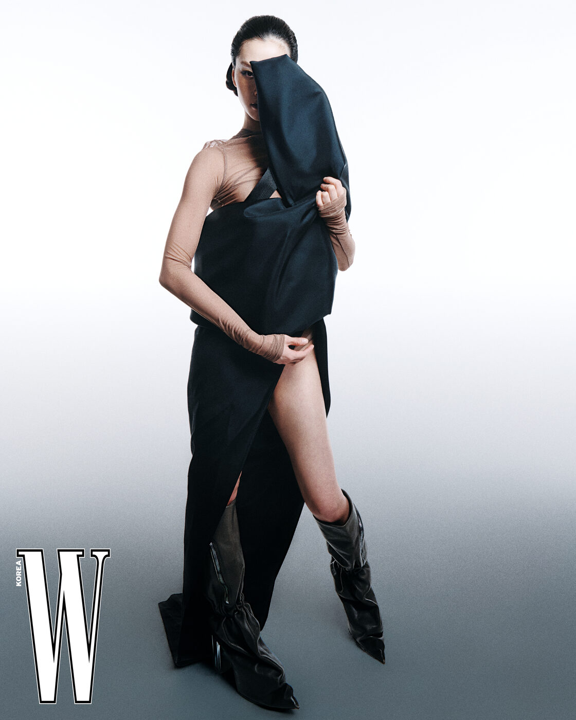 조형적인 실루엣의 드레스, 시스루 톱, 부츠는 Rick Owens 제품.