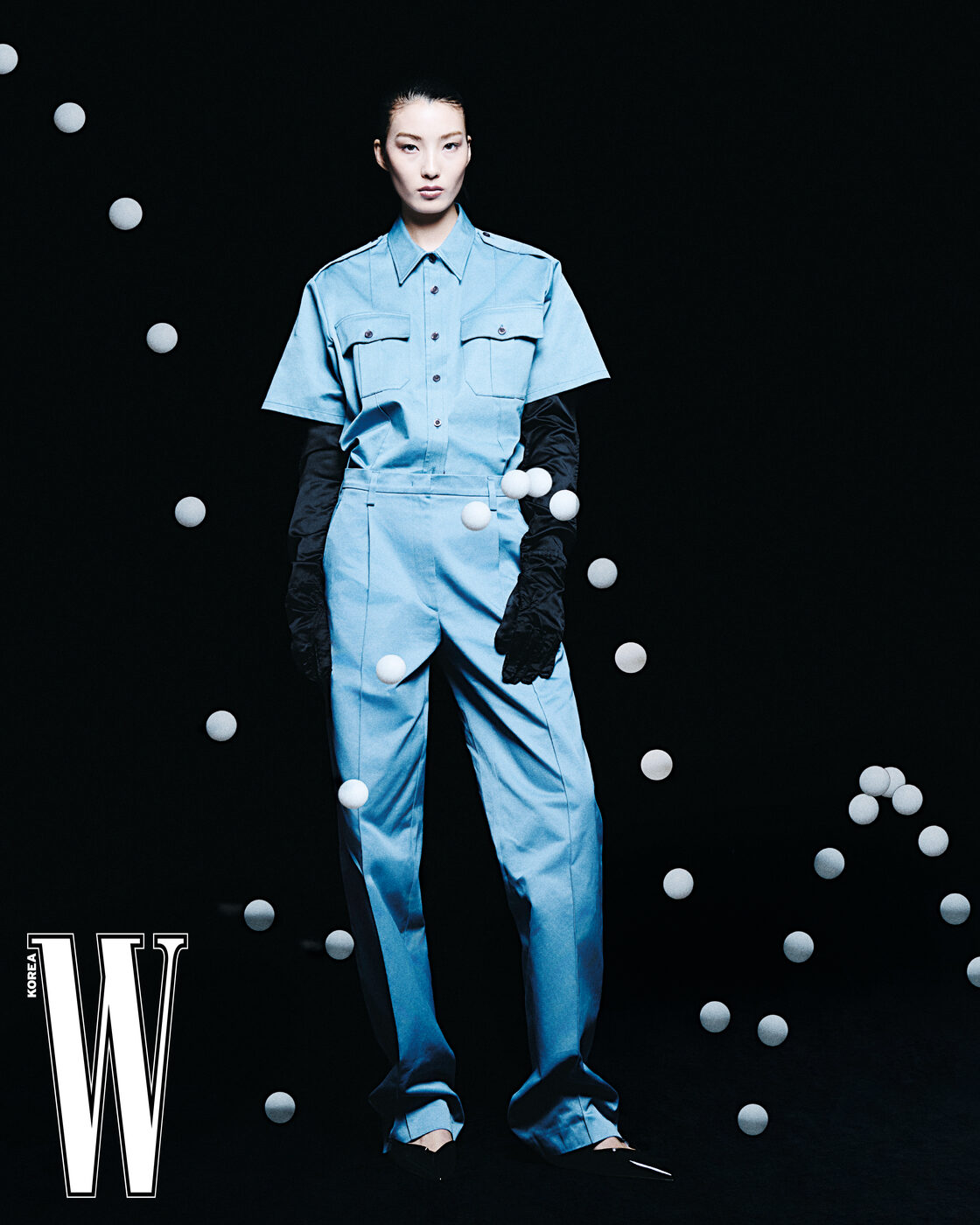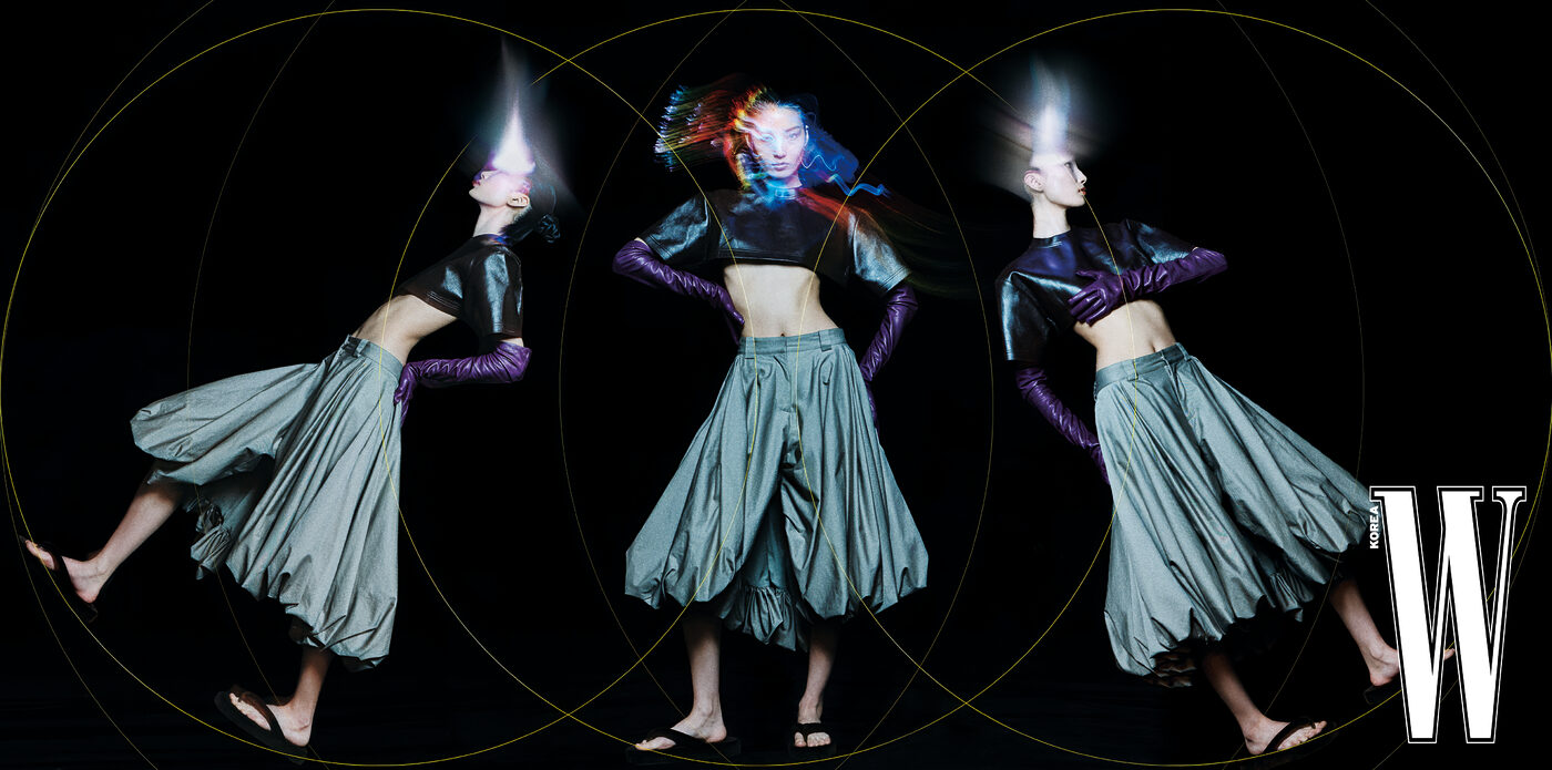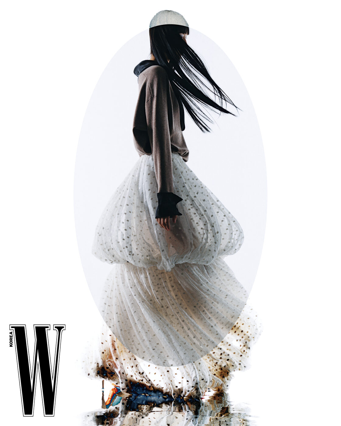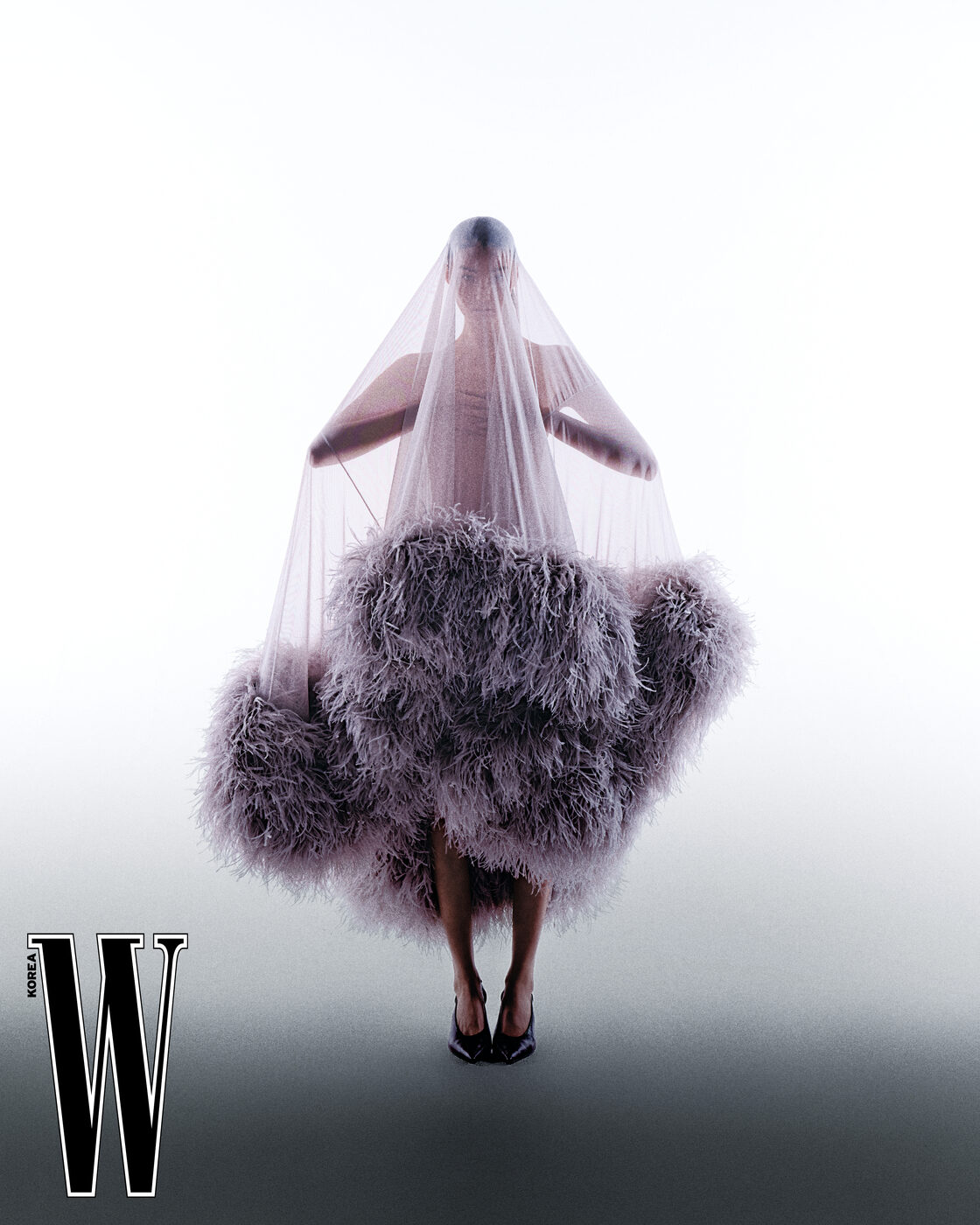 오간자 코쿤 실루엣 드레스는 Balenciaga, 슈즈는 Oude Waag 제품.