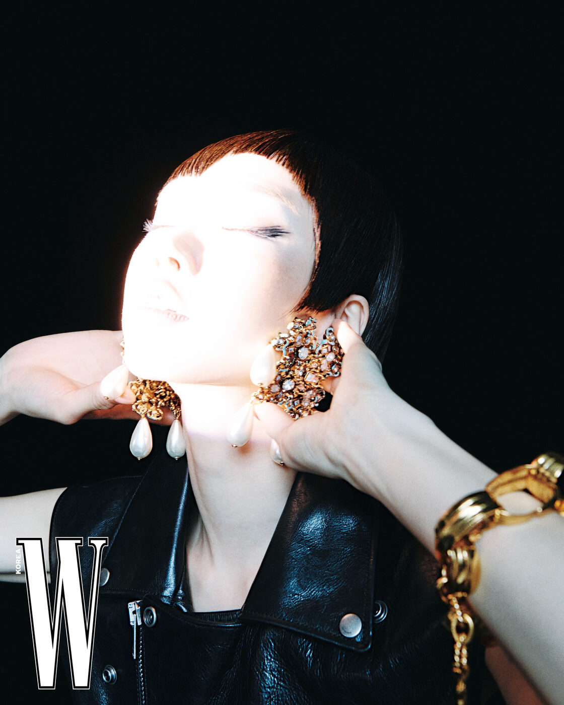 가죽 베스트, 이어링, 체인 브레이슬릿은 Saint Laurent by Anthony Vaccarello 제품.