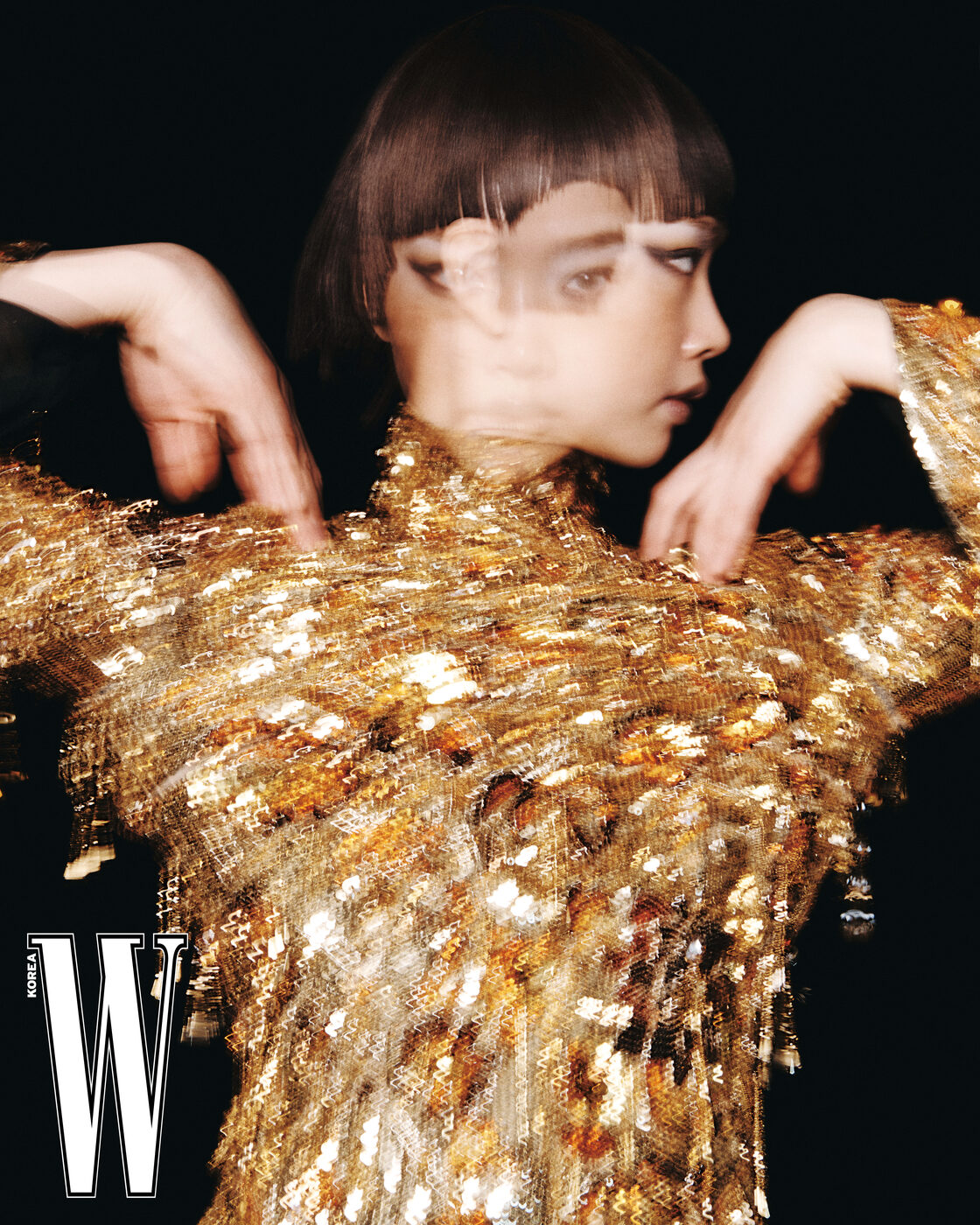 화려한 시퀸 장식 드레스는 Gucci 제품.