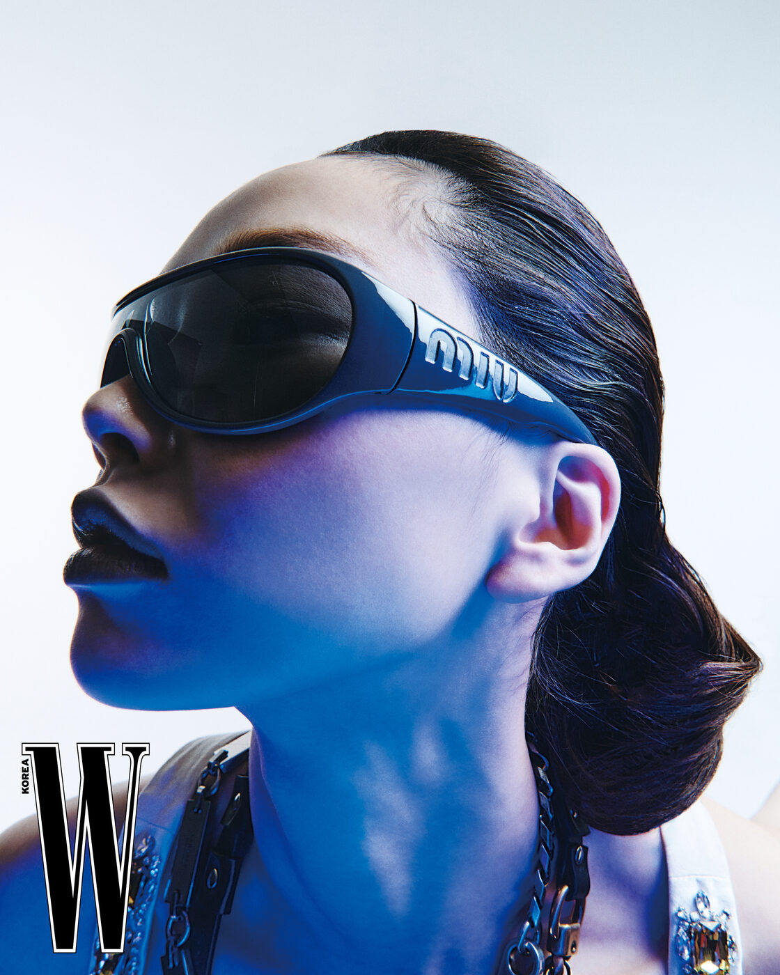 선글라스, 드레스, 체인 장식 목걸이는 Miu Miu 제품.