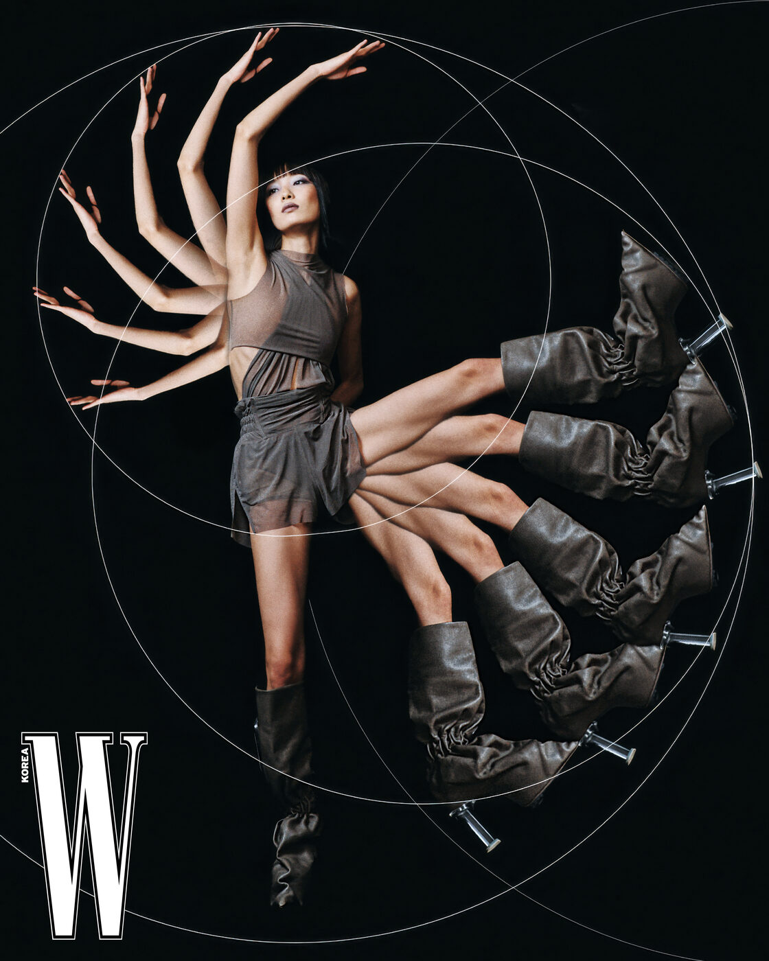 시스루 톱, 바디수트, 쇼츠, 가죽 부츠는 Rick Owens 제품.
