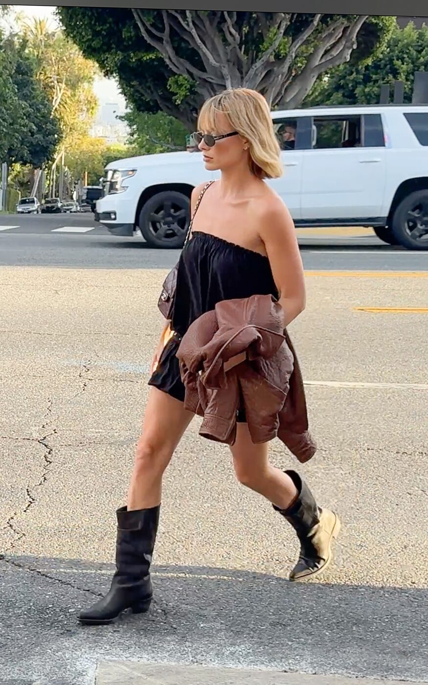 마고 로비 또한 웨스턴 무드를 더한 드레스와 벨트의 조합에 발을 들였어요. 오프 숄더 디자인의 미니 주름 장식 드레스는 복고 분위기를 물씬 풍기죠. 베이비돌 라인의 드레스를 그냥 입는 다면 유치해 보일지 모릅니다. 여기에 스터드 디테일의 블랙 레더 벨트로 허리를 잡아줘 2000년대 감성을 연출했어요. 웨스턴 부츠와 레더 재킷으로 완벽한 마무리를 선보였죠.
