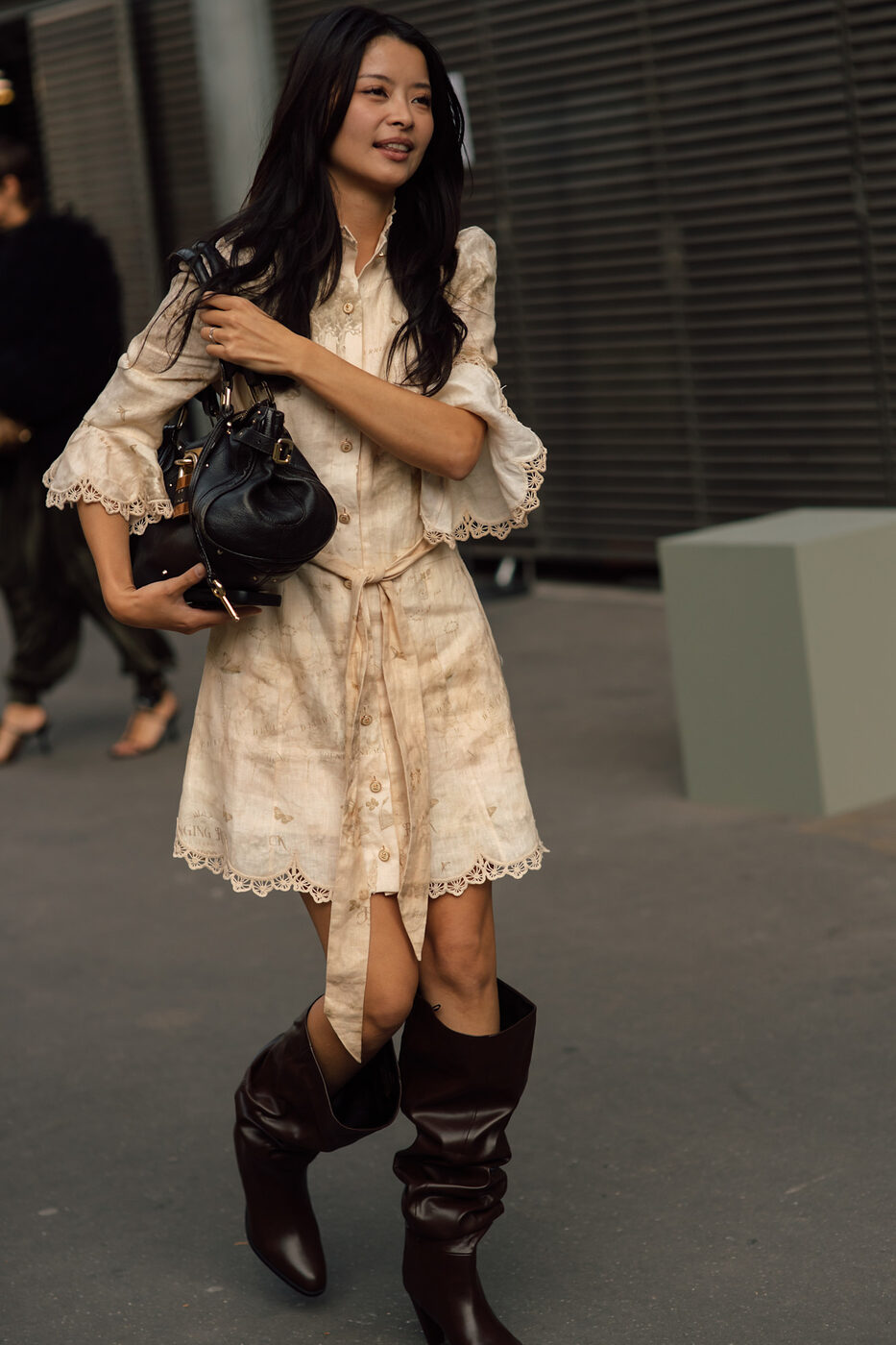 레더 벨트가 없다면 코튼 소재의 끈 혹은 스카프로도 벨트를 연출해 줘야 합니다. 허리에 이 끈 하나가 있고 없고가 이번 시즌 드레스 스타일링을 패셔너블하게 만들어 주는 킥이 될 거거든요. 드레스와 비슷한 소재에 톤이 살짝 다른 벨트라면 가장 완벽해요. 보호 시크를 위해선 날이 더워도 롱 부츠 혹은 슬라우츠 부츠 정도는 신어야 그 맛이 삽니다.