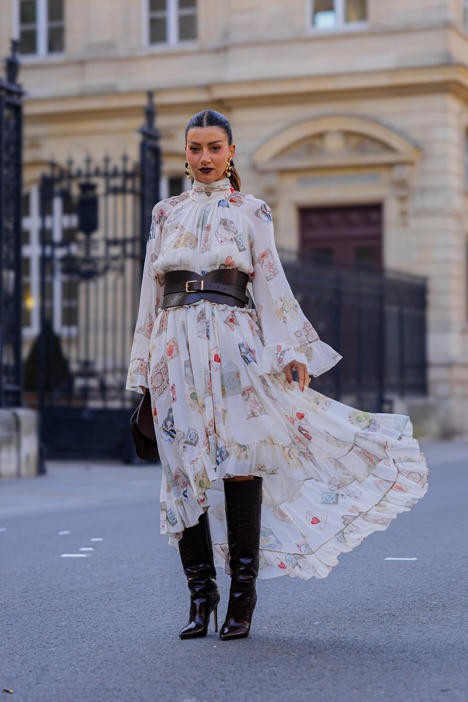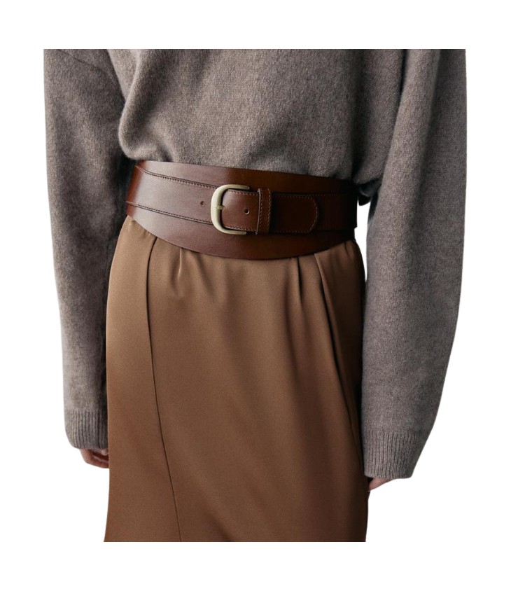 좀 더 힙한 느낌으로 드레스와 벨트 스타일링을 연출하고 싶다면 벨트의 높이를 낮추세요. 허리를 조이는게 아니라 골반에 걸쳐진 듯, 느슨하게 매는 게 더욱 트렌디해 보이죠. 풍성한 러플 장식의 공주풍 미디 드레스조차 모던하고 반듯한 짙은 브라운의 레더 벨트를 착용한다면 한층 더 시크한 옷차림이 완성됩니다.