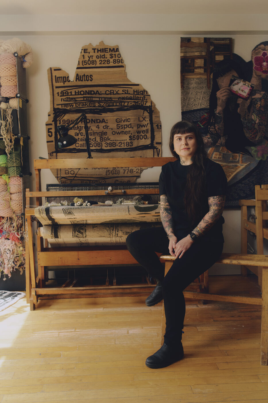 아동 학대나 가정 폭력 같은 민감한 주제를 자기만의 서사로 풀어내는 예술가 에린 M. 라일리(Erin M. Riley) 역시 디지털 기술에 별다른 매력을 느끼지 못했다. 라일리는 브루클린에 있는 자신의 스튜디오에서 전통 직기로 사진처럼 정밀한 태피스트리를 제작하고 있다. 지난가을에는 뉴욕 PPOW 갤러리 전시에서 직사각형이 아닌 불규칙한 형태의 직조 작품을 선보였는데, 그중 하나인 ‘High Miles But Runs Good’은 그녀가 고등학생 때 일기장에 붙여둔 신문 광고를 그대로 옮겨온 작품이다. 내용은 ‘1995년식 혼다 시빅, 1인 소유, 상태 양호, 주행거리 8만9,000마일, 가격 5,000달러’가 전부지만, 신문에 사용된 폰트뿐 아니라 광고를 뜯어내면서 생긴 종이의 들쭉날쭉한 가장자리까지 정교하게 재현해냈다. 라일리는 손으로 직접 만드는 과정 자체에서 의미를 찾으며, 디지털 직기를 쓰지 않아도 작업 속도에 충분히 만족한다고 말한다. 그녀에게 텍스타일 작업이란 일종의 ‘생산적인 딴짓이자 스스로를 자극하는 행동’으로, 파괴적인 일을 하지 않기 위해 스스로를 분주하게 만드는 방법이기도 하다.
