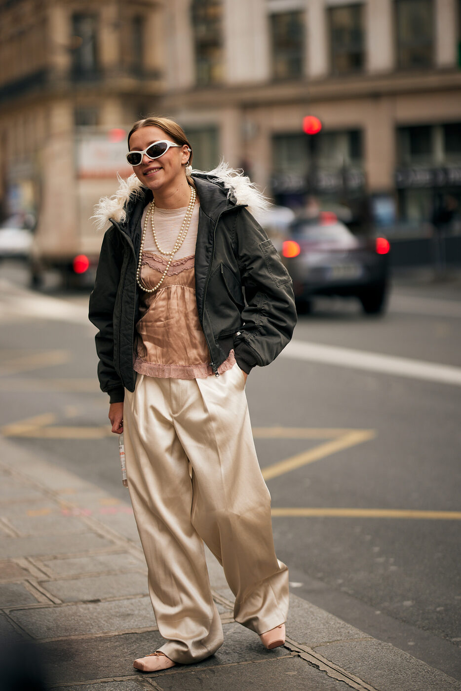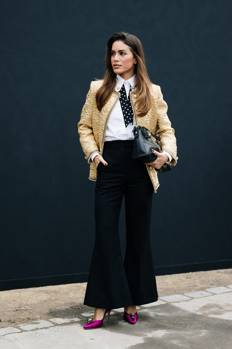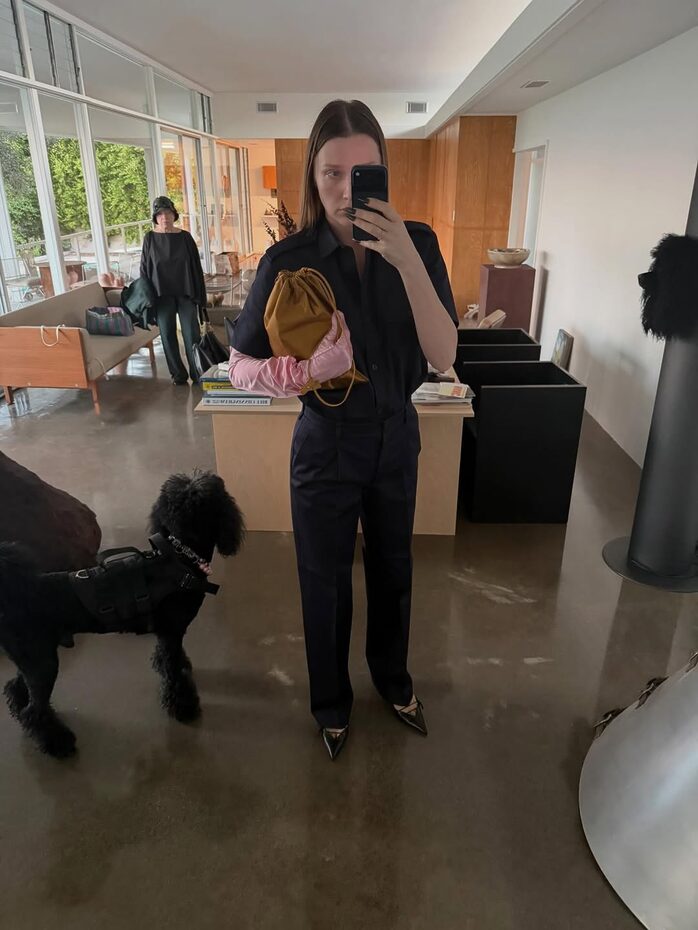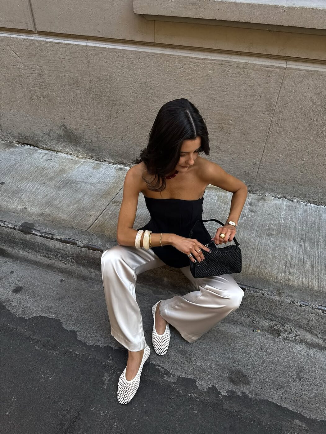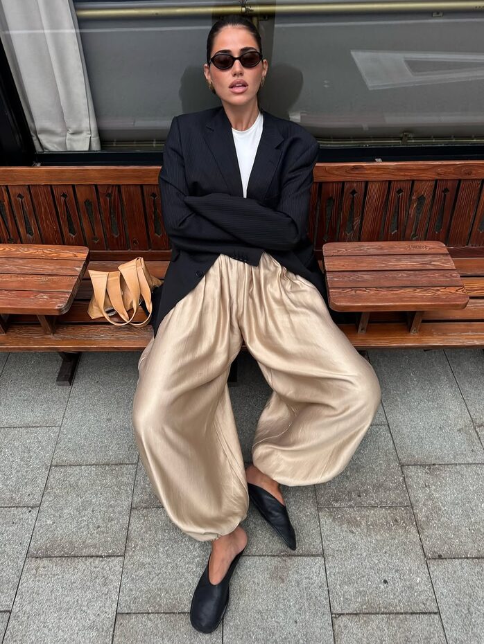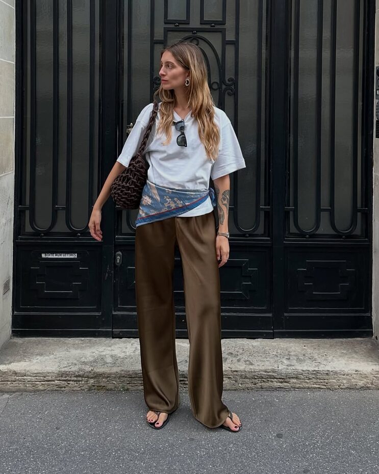 적재적소에 활용한 새틴 액세서리 역시 인상적인 옷차림을 완성하는데 큰 역할을 합니다. 딱히 특별할 것 없는 베이식한 아웃핏이지만 여기에 무심코 신은 새틴 플랫 슈즈 하나로 누군가의 핀터레스트 스타일링 참고 폴더에 스크랩 될 수도 있을지도 모를 일이고요. 매니시한 셔츠 룩에 예상치 못한 새틴 글로브와 파우치를 더해 유쾌함을 드러내는 것 역시 의외의 도파민을 선사하기도 합니다. 손바닥 뒤집듯 쉽게 바뀌는 유행의 흐름 속에서 새틴 트렌드가 여전히 건재한 이유이기도 하죠.