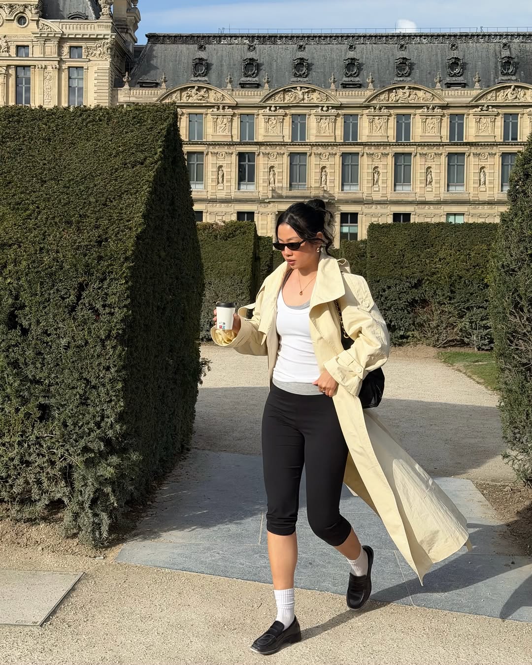 로퍼에 카프리 팬츠라니, 꽤 신선한 조합입니다. 발목을 드러내 다리 라인을 강조하는 대신 발등을 덮는 묵직한 디자인의 로퍼가 룩의 중심을 잡아주며 한층 단정하고 격식 있는 분위기를 완성하죠. 여기에 화이트 삭스를 더한 스타일링이 킥을 더했네요. 몸을 부드럽게 감싸는 롱 트렌치 코트 같은 아우터를 걸치면 출근 룩으로도 손색없는 세련된 아웃핏이 완성됩니다.