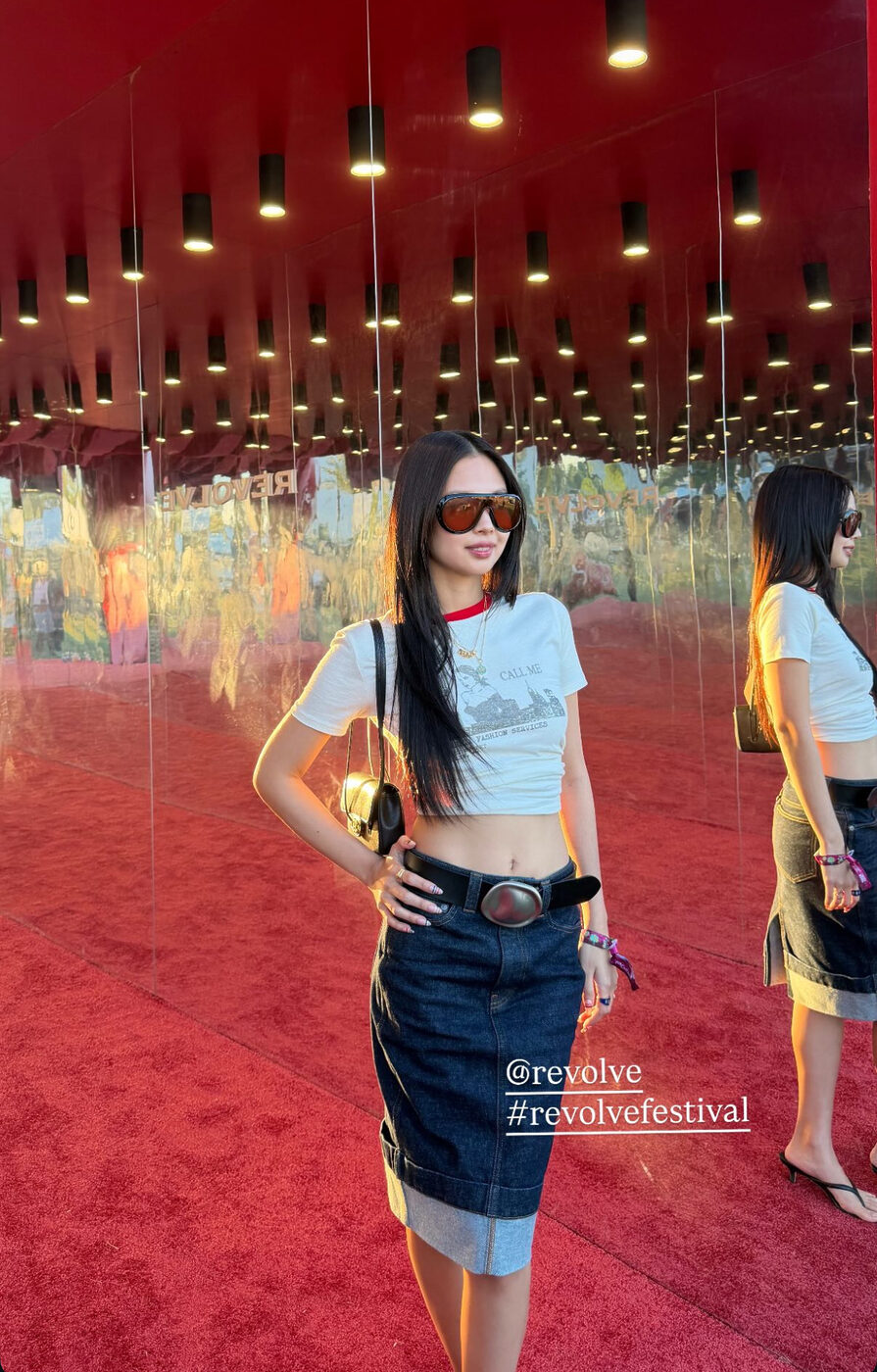 제니의 코첼라 착장은 생지 데님으로 된 미디 스커트였습니다. 팬츠가 아니라 스커트로 선택한 것 자체가 이미 압권이예요. 팬츠보다 훨씬 여성스러운 실루엣을 만들어주면서도 데님의 캐주얼함은 그대로 살렸죠. 그리고 왕만한 버클 벨트를 더해 세련된 무드를 만들었네요. 상의는 프린팅 링거 티셔츠를 크롭 기장으로 걷어 올렸고요. 유행하는 요소를 한 몸에 담고도 과하지 않은, 트렌디의 정석 같은 착장이라 말할 수 있겠군요.