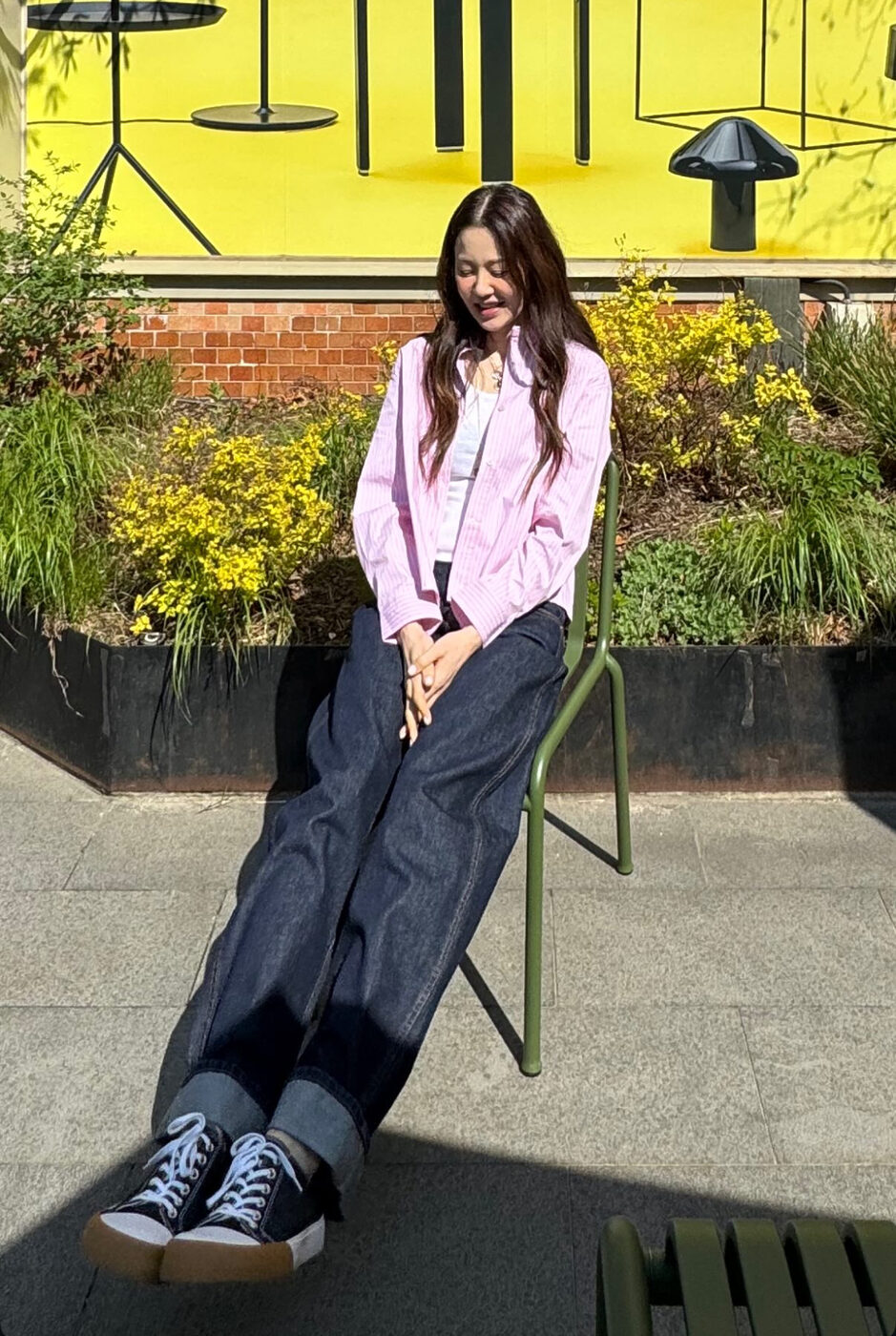 고현정의 핑크 셔츠가 유독 화사하고 밝아 보였던 건 아래의 인디고 덕분이었을지도요. 이 생지 데님이 워낙 짙은 색이라 어떤 컬러와 함께 매치해도 그 색을 더 돋보이게 만드는 특성이 장점이라 할 수 있는데요. 반대로 상의를 화이트나 크림으로 바꾸면 훨씬 미니멀하고 깔끔한 무드가 됩니다. 같은 인디고 팬츠 하나로 상의 컬러만 바꿔도 전혀 다른 분위기를 낼 수 있다는 뜻이죠.