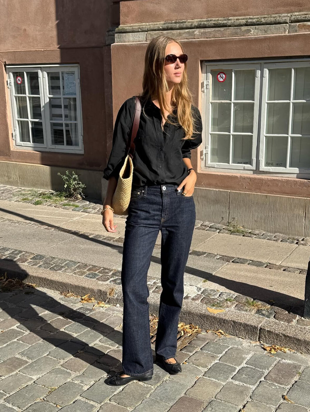 인디고 데님을 세련되게 입고 싶다면? 상의는 고민 말고 블랙을 꺼내세요. 검은색과 이 청바지의 조합은 고민 없이 집어 들어도 되는 공식이니까요. 아멜리에 무스가드처럼 베이직한 블랙 셔츠나 티셔츠를 바지 안에 넣어 입기만 해도 절반은 성공입니다. 인디고는 블랙과 톤이 비슷하게 맞물리면서 고급스러운 무드를 풍기거든요. 여기에 벨트나 가방까지 블랙으로 톤을 맞춰주면, 군더더기 없이 깔끔하면서도 꾸안꾸의 정석이 완성됩니다.