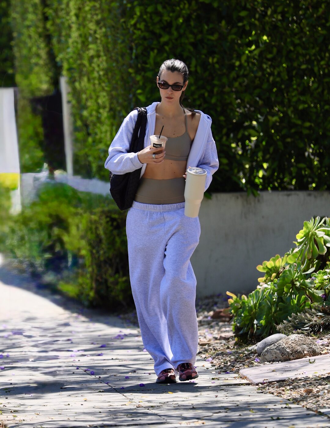 운동 끝나고 겉옷만 후루룩 입고 나서고 싶을 때가 있지 않나요? 그럴 때 참고하면 좋을 비토리아 세레티의 룩입니다. 카키빛 브라와 팬츠 위에 루즈한 핏의 회색 후드 점퍼와 조거 팬츠를 걸친 그녀. 어울리는 계열로 색을 맞추니 일부러 연출한 듯 의외의 스타일리시한 룩이 완성되었죠.