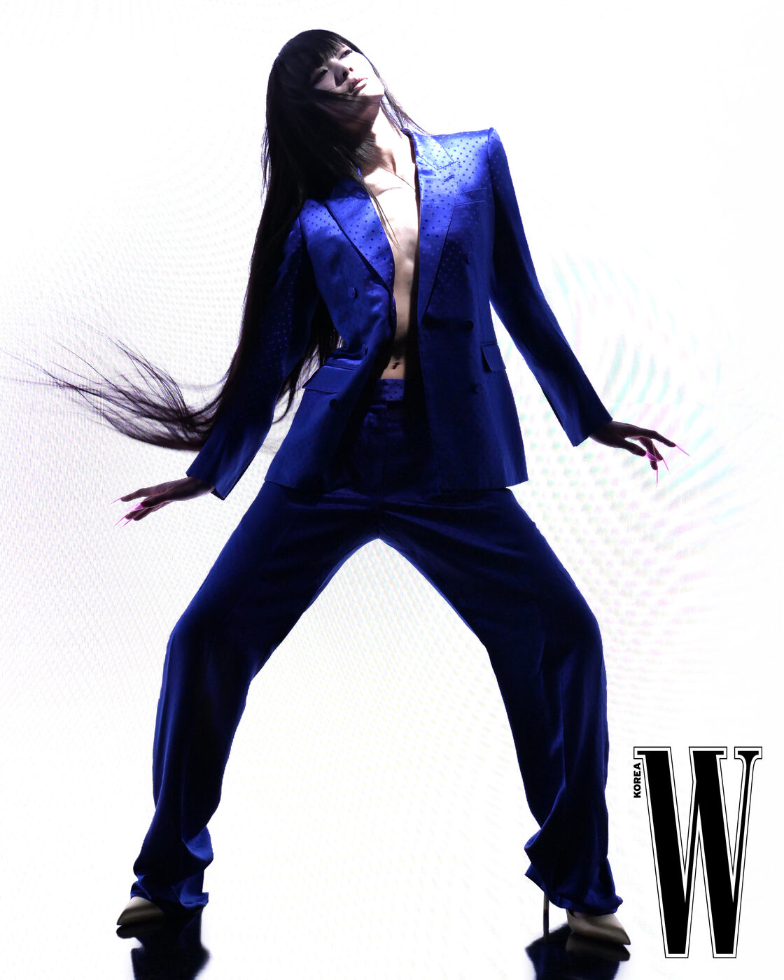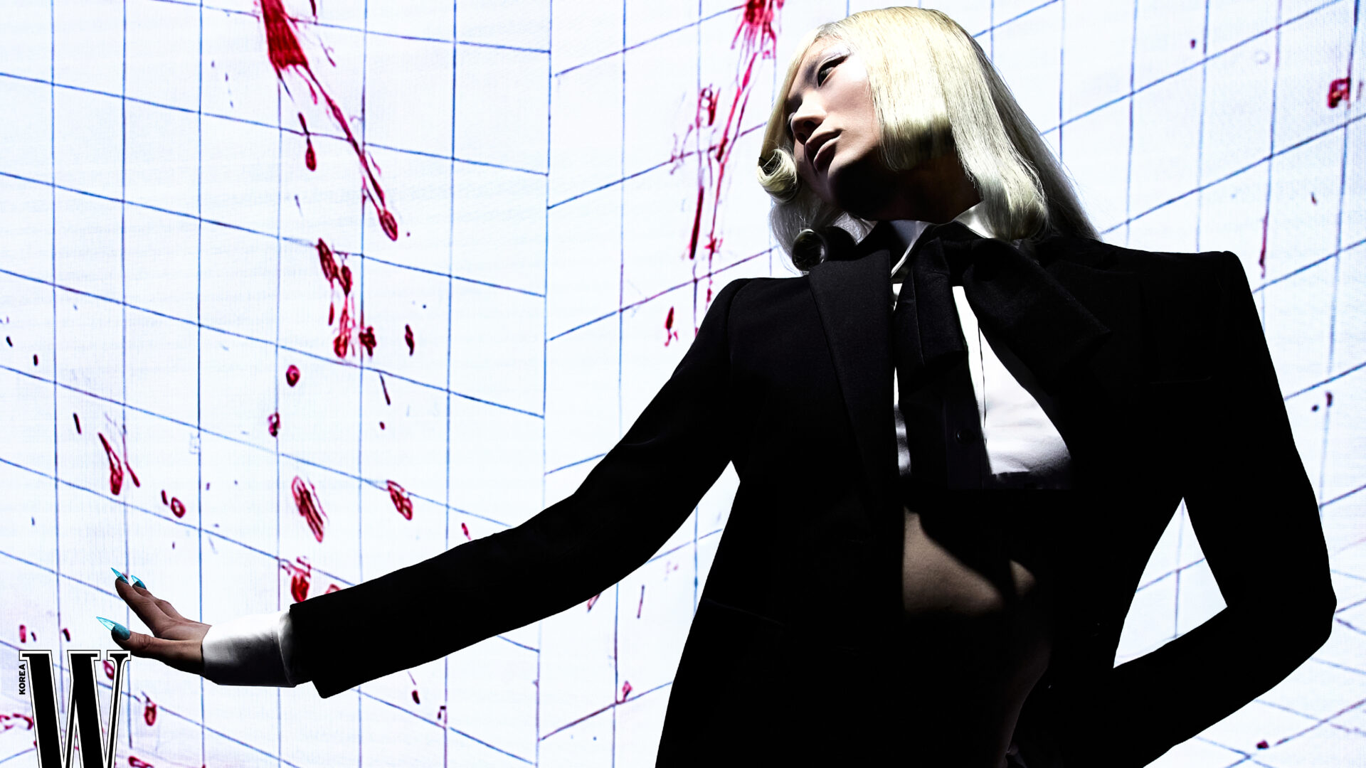 크롭트 셔츠, 테일러드 재킷과 테일러드 팬츠, 보 타이는 발렌시아가 제품.