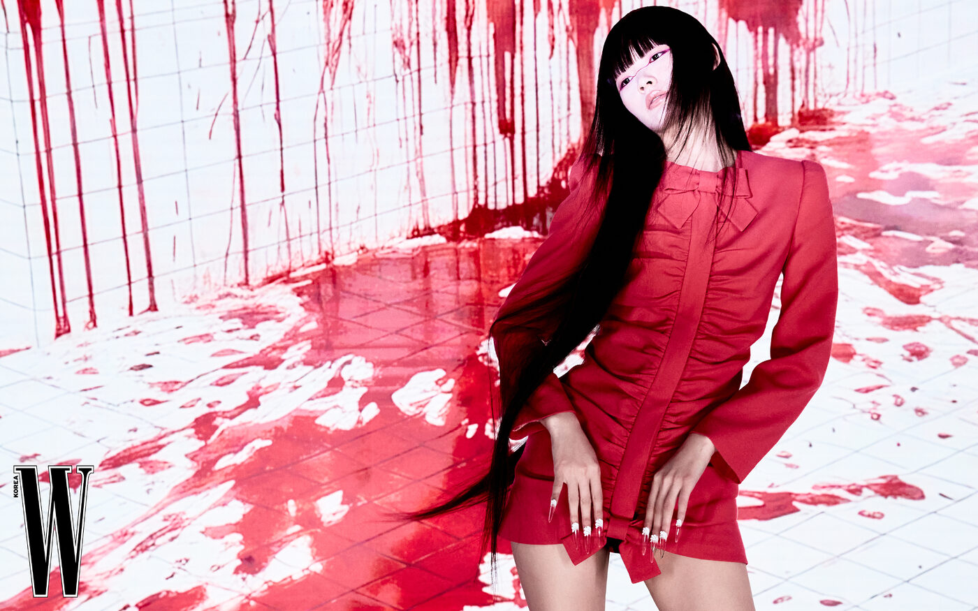 리본 장식 미니 원피스는 발렌티노 제품.