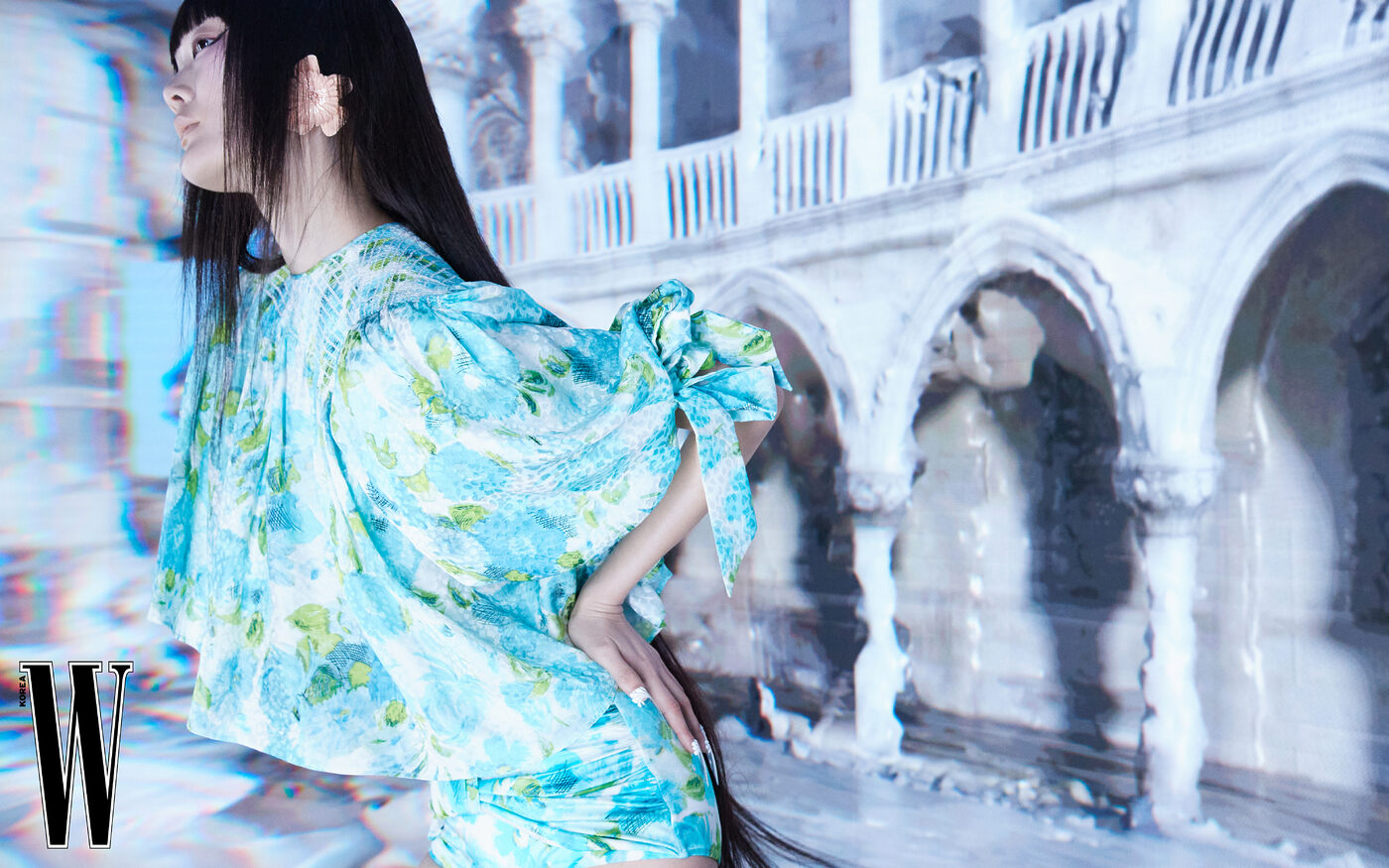 꽃무늬 블라우스, 쇼츠, 꽃 모양 이어링은 끌로에 제품.