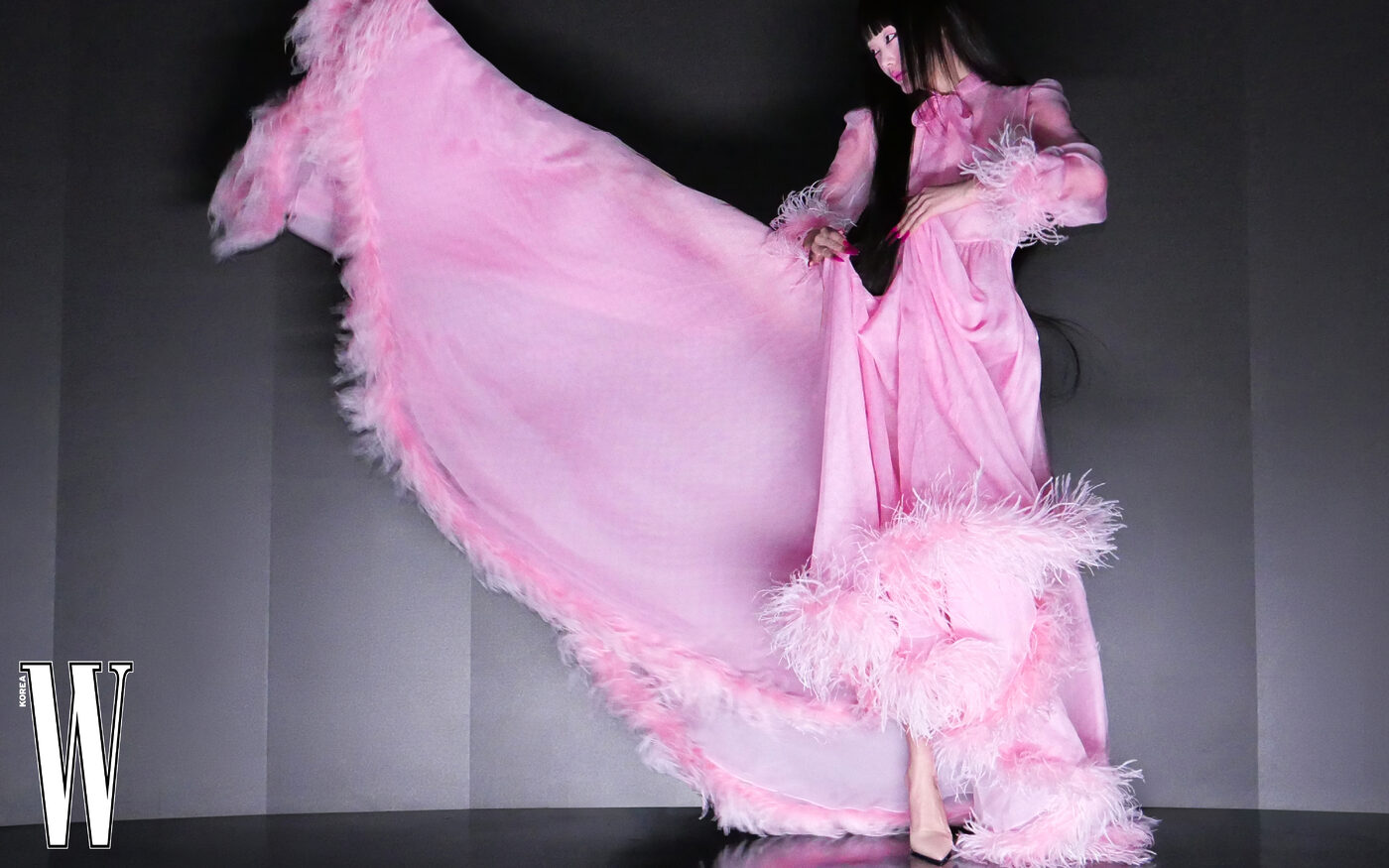 깃털 장식 드레스, 가죽 하이힐은 구찌 제품.
