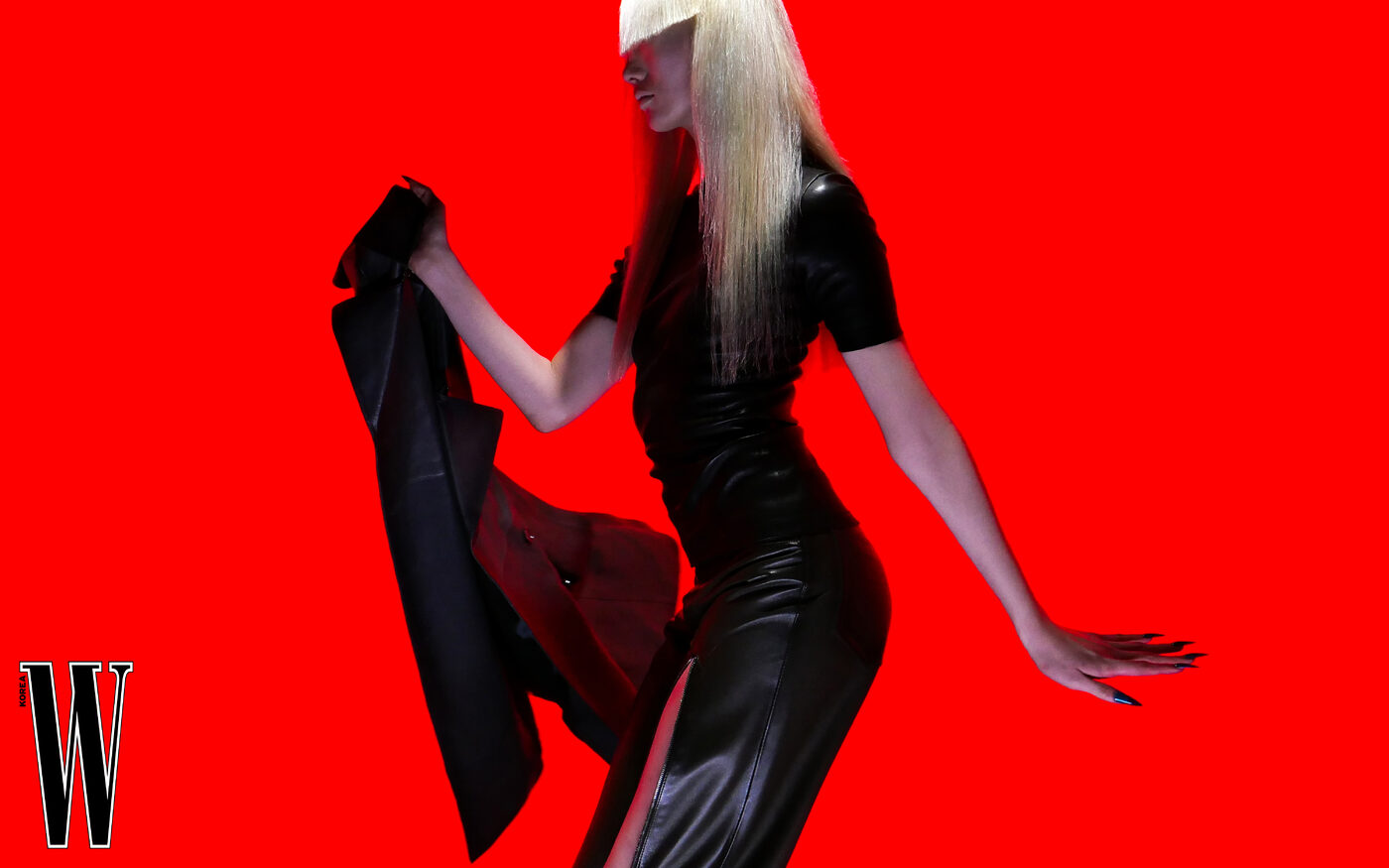 가죽 톱, 팬츠, 가죽 트렌치코트는 아크네 스튜디오 제품.