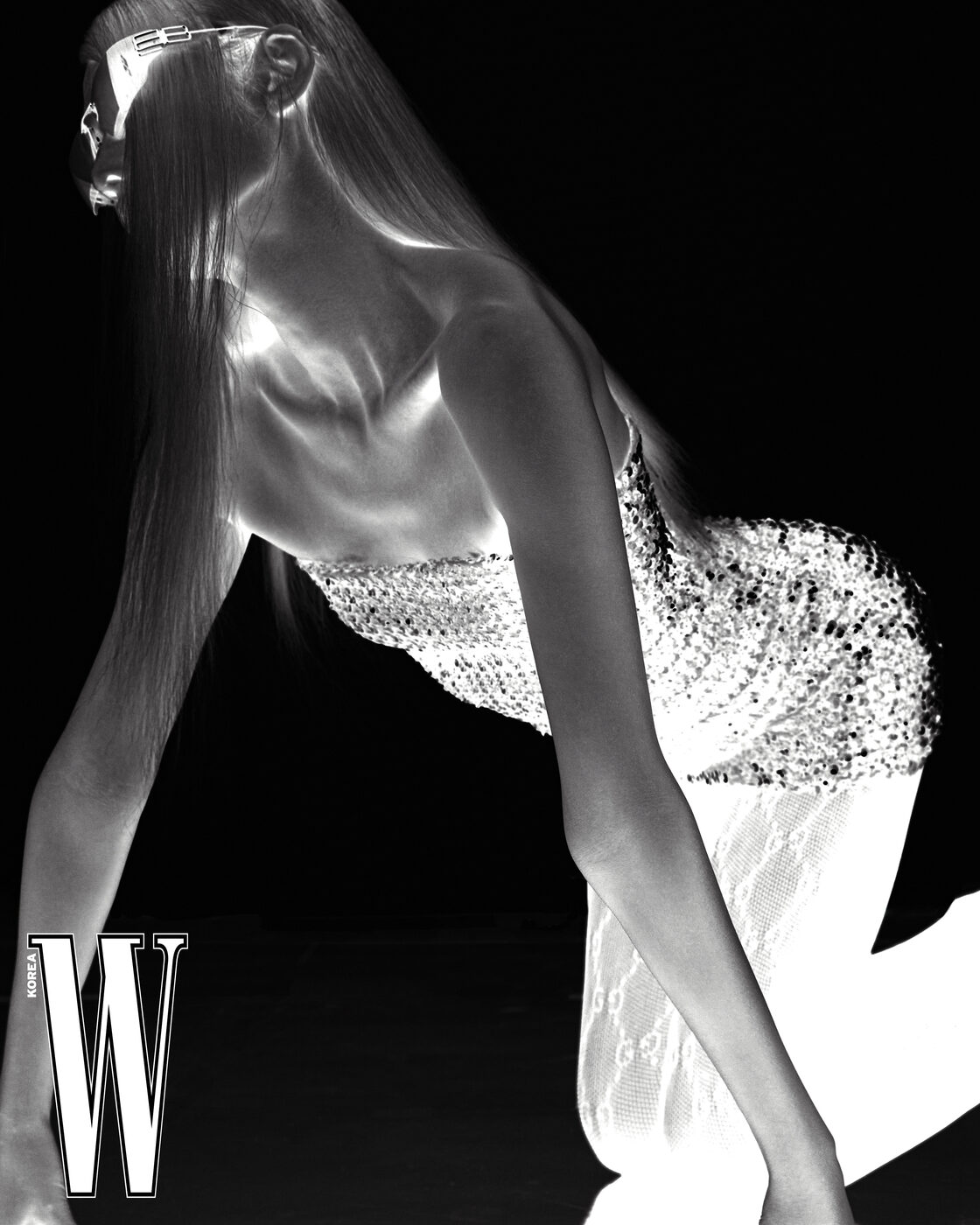 시퀸 장식 미니드레스, 로고 스타킹은 구찌, 선글라스는 발렌시아가 제품.